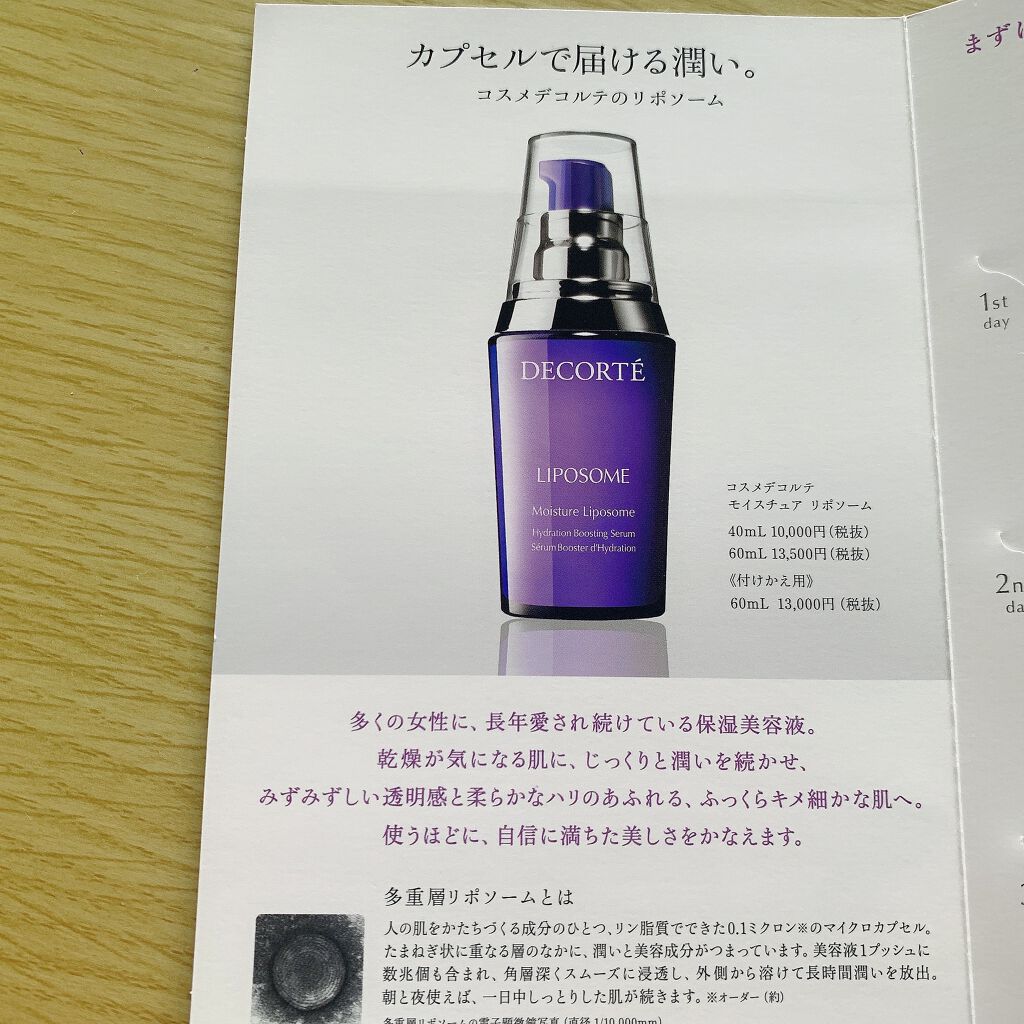 - 多重層リポソームを採用した化粧品として、“モイスチュアリポソーム”の愛称とともに、長年親しまれているコスメデコルテの保湿美容液です。 洗顔後すぐ肌になじませると、直径0.1ミクロンのリン脂質のカプセルが角層深くまでスムーズに浸透。 外側の膜から少しずつ美容成分を放出するので、かさつく肌はいつまでもしっとり。 キメをふっくら整え、ハリのあるなめらかな肌をかなえます。