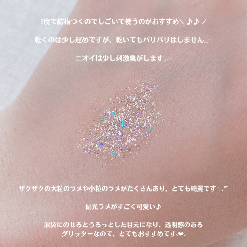 細かいラメと大きめのホログラムが混じっています꒰ˆ•ﻌ•ˆ꒱ 瞬きする度にキラキラしてかわいいです。 よく見ると色々なカラーのラメでてきていますがつけると自然ですฅʕ •ﻌ• ʔฅ