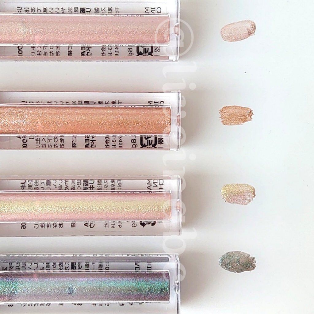 浅草桜は白みのピンクで多色ラメが綺麗です。うるうるしてて本当に涙袋にピッタリのお色! ミルクティータイムはちょっとピンクみのあるベージュで、1色でグラデにしても綺麗に出来そうです✨ ホワイトっぽいベースにグリーンラメの夕日の森と、ブラウンベースにブルーラメの青い燈火は偏光ラメが好き過ぎてお迎え✨ 一番気になってた青い燈火は意外とベースの色は発色しなくて青ラメのおかげか、グレーやパープルっぽく見えます。こちらもラメがめちゃめちゃ目立つのでポイント使いですが、とにかく美しいです…💙 水っぽいさらりとした質感で伸びも良く、特に浅草桜とミルクティータイムは時間が経ってもくすんだりよれたりもせずでした✨