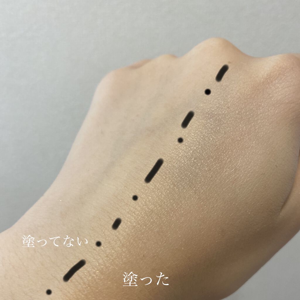 トーンアップするか否かの確認が漏れていて、無色透明のつもりで購入。開封時にパッケージを見てトーンアップやん!?!?となりました。しかしトーンアップと言っても艶で明るく見える程度の仕上がりで好みでした。 無色透明の方がベースメイク前に仕込むのに使いやすく、そのまま首やボディも塗れちゃうので手軽なんですよね。 塗りたては少しべたつくものの、時間が経つとベタつきは感じずしっとりとした触り心地に。