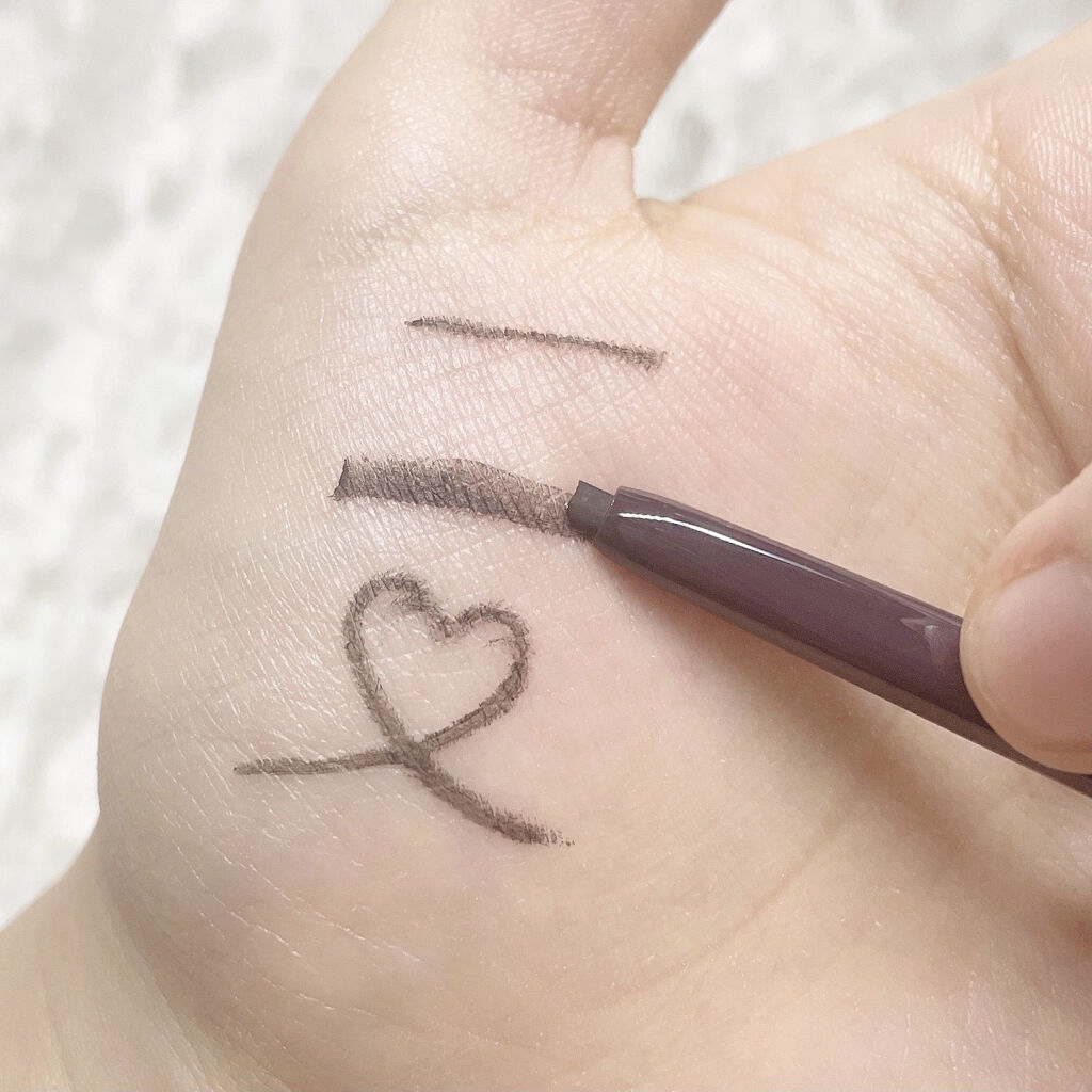 細い?薄い?楕円形の芯で細くも太くも描ける。 繰り戻し可能。 ウォータープルーフタイプ。水系は分からないが、擦れには強かった。 ほんのり赤みのあるブラウンで肌なじみが良い。