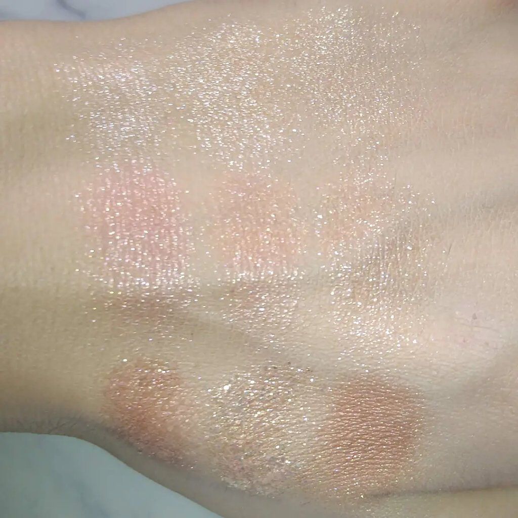 全部ラメ!キラキラ好き大歓喜のパレット😍😍😍 左下2色のグリッターはしっとりぺたぺたしている質感で瞼にしっかりくっついてくれます! ざっくり言うと上段はキラキラ中段はツヤツヤ下段はギラギラというイメージです。 全体的に色づきは控えめでラメ感を楽しめる🥳 全部キラッキラの宝石みたいな多色ラメですが、上段は青ラメ、中段はピンクラメ、下段はゴールドラメが目立つなーと思いました💖 名前も可愛い☁