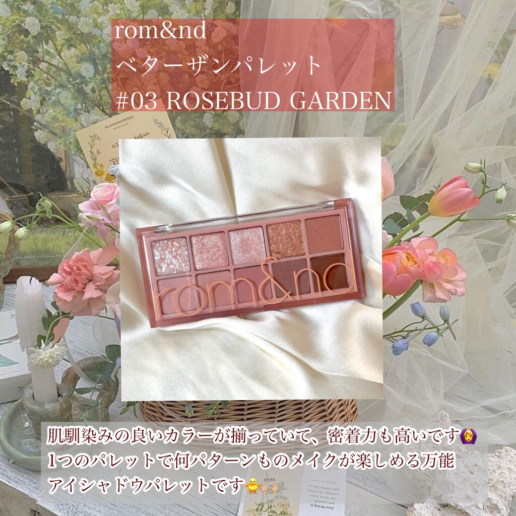 \イエベの透明感ローズピンクメイク🌹✨/【使用したアイテム】rom&ndベターザンパレット#03ROSEBUDGARDEN【色味】ドライローズのインディピンクからローズピンクまで揃っていて、血色感が上がるカラーです🙌🏼【ラメorマット】マット...