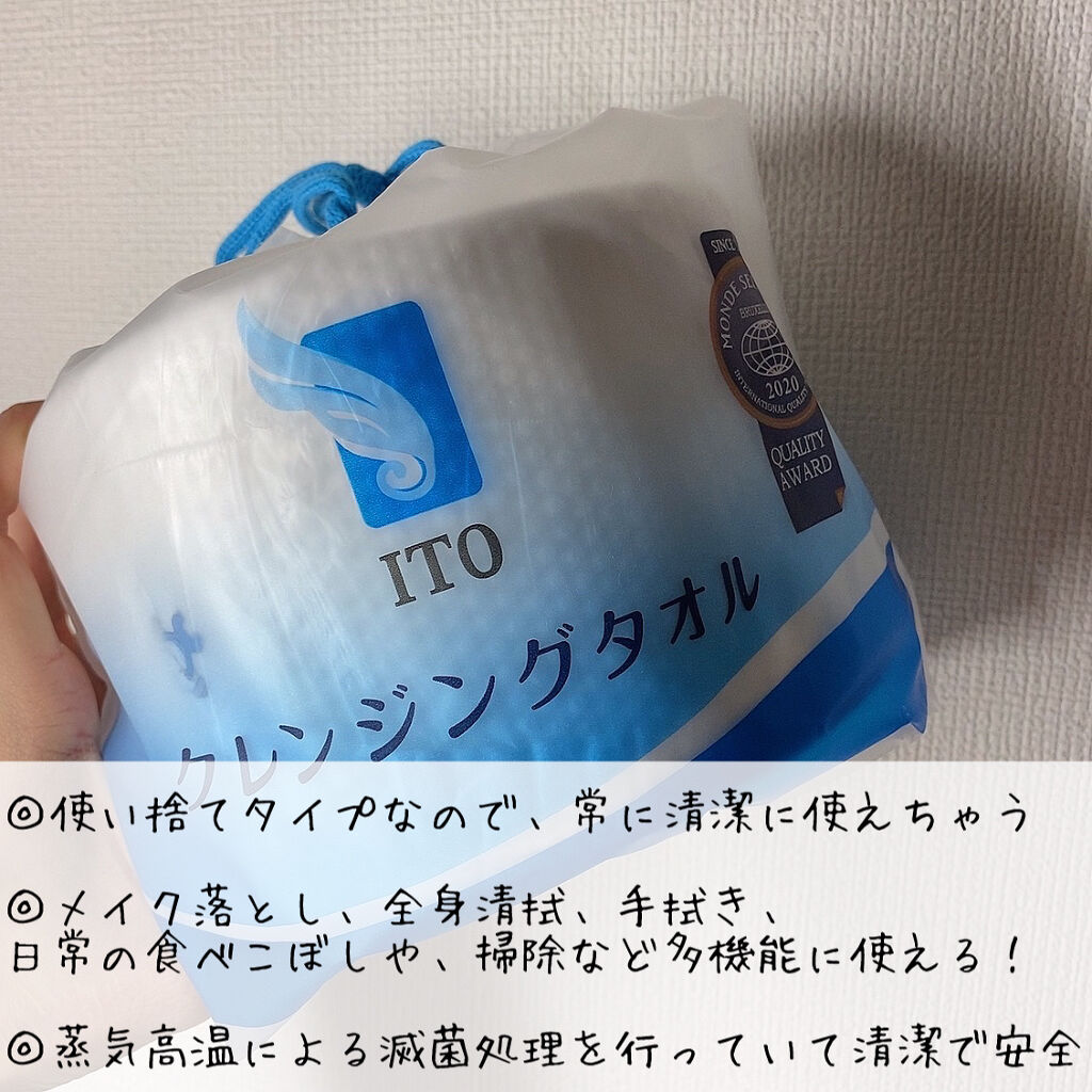 ITOのクレンジングタオルを使用したよ︎💕︎ ロールタイプの使い捨てタオルなんだけど、洗顔後の拭き取りやメイク落としの拭き取り以外にもマニキュア落とし、汗拭きなどに使えるアイテムなんだ! 破れにくく丈夫だし、天然素材を使用しているから肌触りが優しくて、毛羽立ちにくいから使いやすかったよ♡ 蛍光漂白剤不使用だから赤ちゃんにも使えるんだって👶 使い切りだからいつでも清潔に使えるのに、洗濯の手間もなくておすすめ☝️