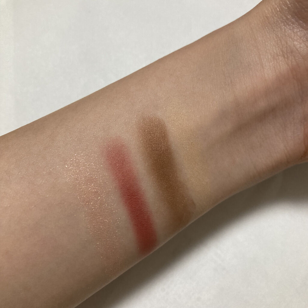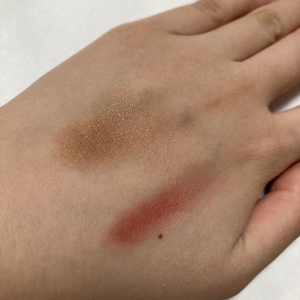 粉質はサラサラで指でもブラシでも塗りやすい ラメ飛びは少ないが全く無いわけではない ベージュをブラシにとってアイホール全体と下瞼に広げる レッドを小さいブラシに取って手の甲で薄めてから二重幅少しはみ出すぐらいまで塗る(薄めがいい時) コーラルを大きめのブラシに取ってレッドを広げた境目からフワッとつけるor黒目の上にちょんちょん ブラウンはお好みで締め色として入れたり入れなかったり