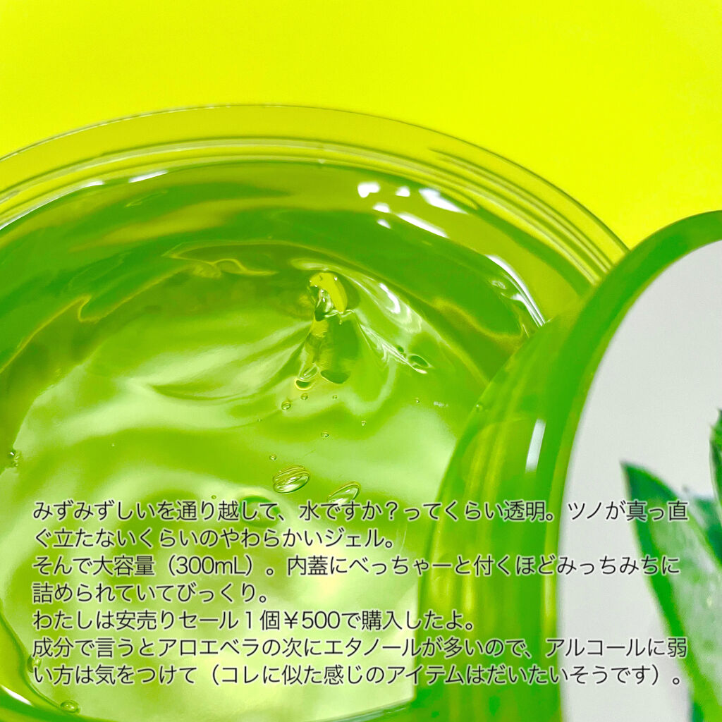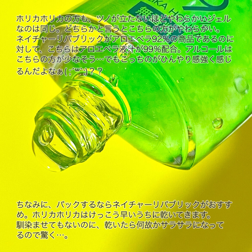 HOLIKAHOLIKA(ホリカホリカ)アロエ99%スージングジェル55ml(微香性)LIPSショッピングで購入しました。55mlのミニサイズなんですが、お安いです。税抜380円。済州島原産のアロエベラ液汁を贅沢に99%配合しているそう...