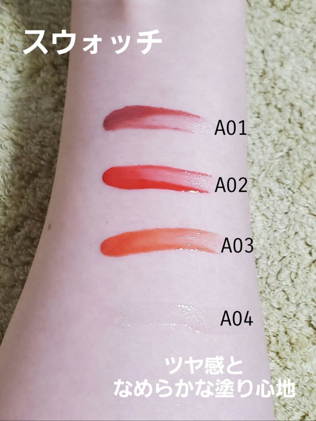 最近のティントは昔よりだいぶいいものの、それでも塗った直後から特有のヒリつきを感じる事がありましたが、それがない!✨ テクスチャーについてはリップクリームとかオペラのリップティントに近いかな? 私は唇も時々荒れているのですが今までの落ちにくいリップの中ではダントツにヒリヒリしない!✨ そしてティッシュオフ後ですが、ほんとに落ちない!! めんどくさがり屋の私にはピッタリです✨ 発色が弱めだからと、べっとり塗ってティッシュオフするとかなり落ちます😱 逆にリップクリームの要領で塗って唇軽くすり合わせるくらいだとピタッと密着して取れなくなりました✨ 発色はティッシュオフすると柔らかめになります💦 それでもほんのり残るのでかなり優秀だとは思います。 「ナチュラルな仕上がりで落ちにくいリップ」を求めている人にはピッタリな商品です。 私はまさにこういうリップを求めていたのでリピート確定です!!
