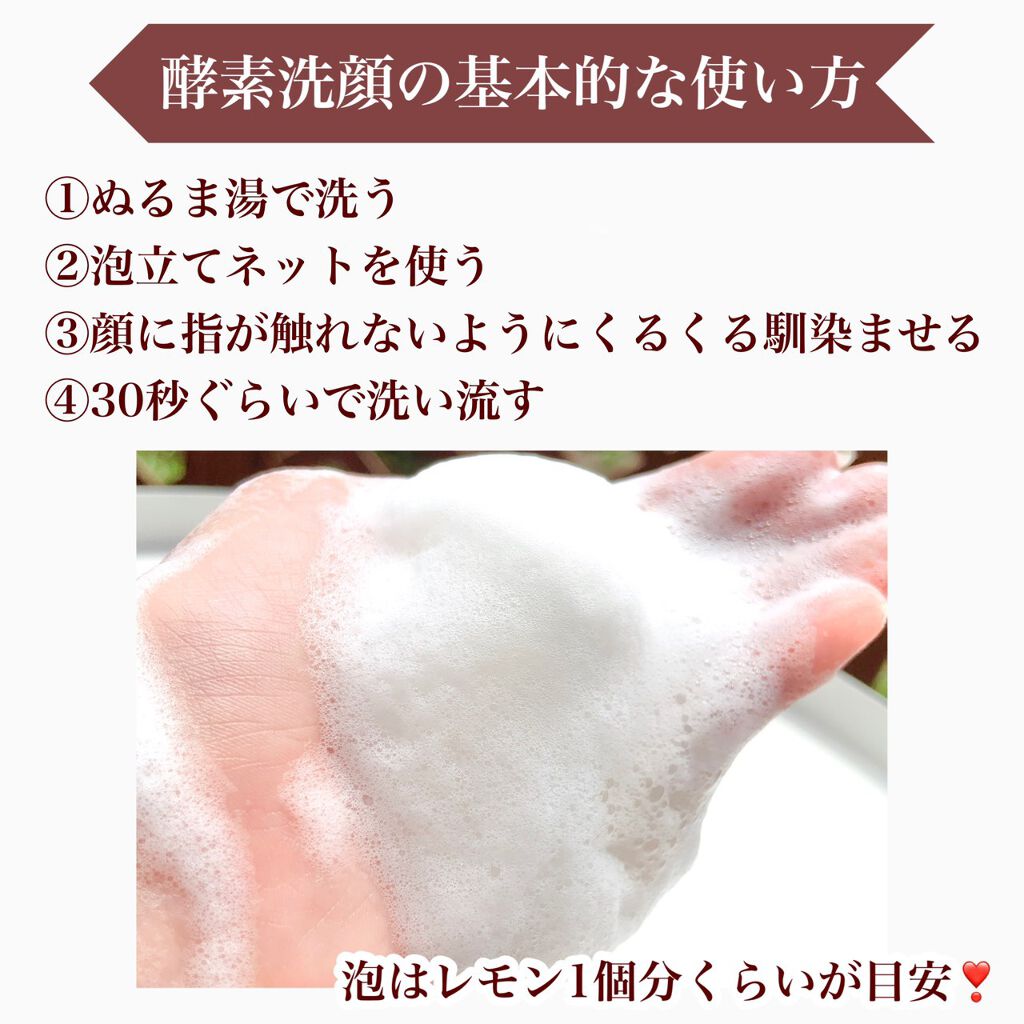 - 毛穴の黒ずみ・ザラつき・くすみを洗う酵素入り洗顔パウダー。 炭酸※1 ×酵素※2 ×クレイ※3 のトリプルパワーで古い角質・毛穴汚れにしっかりアプローチ。 洗うたび、透明感※4 のあるつるすべ肌に。 週に2~3回の使用がおすすめです。 ※1 炭酸Na(洗浄成分) ※2 プロテアーゼ、パパイン(洗浄成分) ※3 カオリン(吸着洗浄成分) ※4 古い角質や汚れを洗い流すことによる