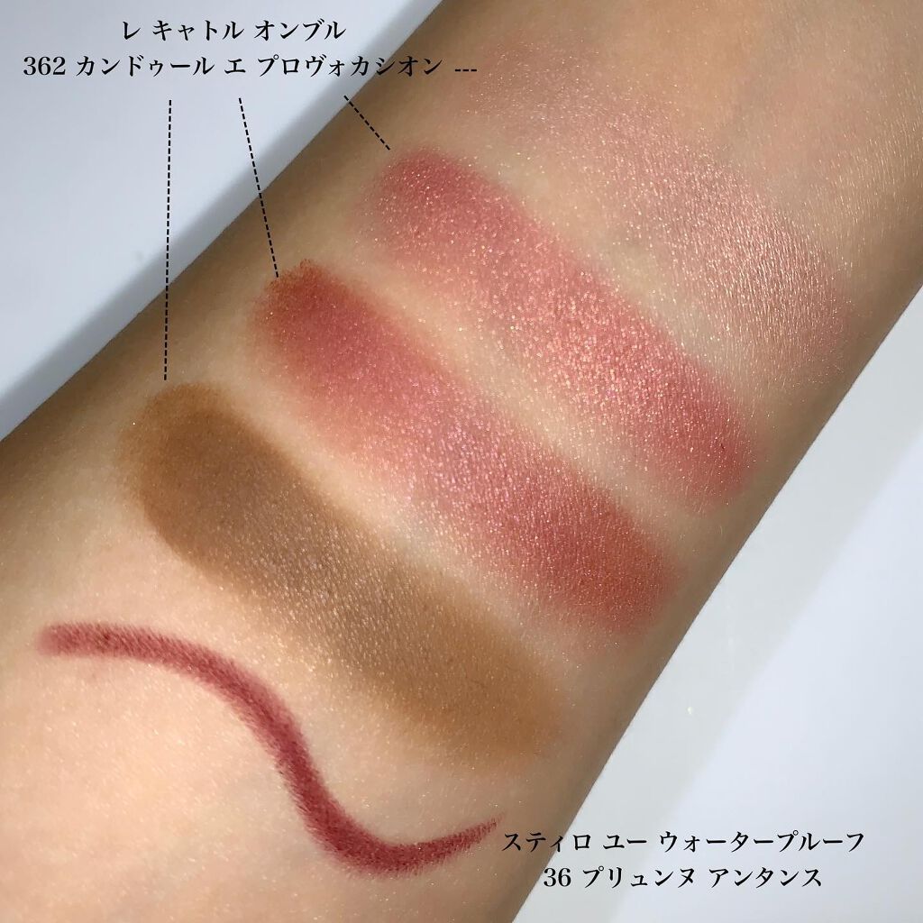 今回の新色は"まぶたに濡れたような光沢を放つ艶、光を操る立体感をプラスしリュクスなまなざしを叶えてくれる"というプリズムフォーミュラ。 確かにいつもとはちょっと違う…良いですこれ🫶❤️ ヌメッと面で光るようなツヤ感✨ テクスチャーは刻印ありタイプ、ツヤはクリームタイプに近いと思います🥰 要は刻印ありとクリームの良いとこ取りですね! ゴールドと柔らかいレッドの組み合わせ。アプレスキーとエレクトリックチェリーの中間のような色合い🤔 ゴールドとピーチカラー。今回の3色の中では一番黄みが強い。 青みがかったローズが可愛い。ぱっと見はわからないけど左上にみんな大好き青ラメが…!!