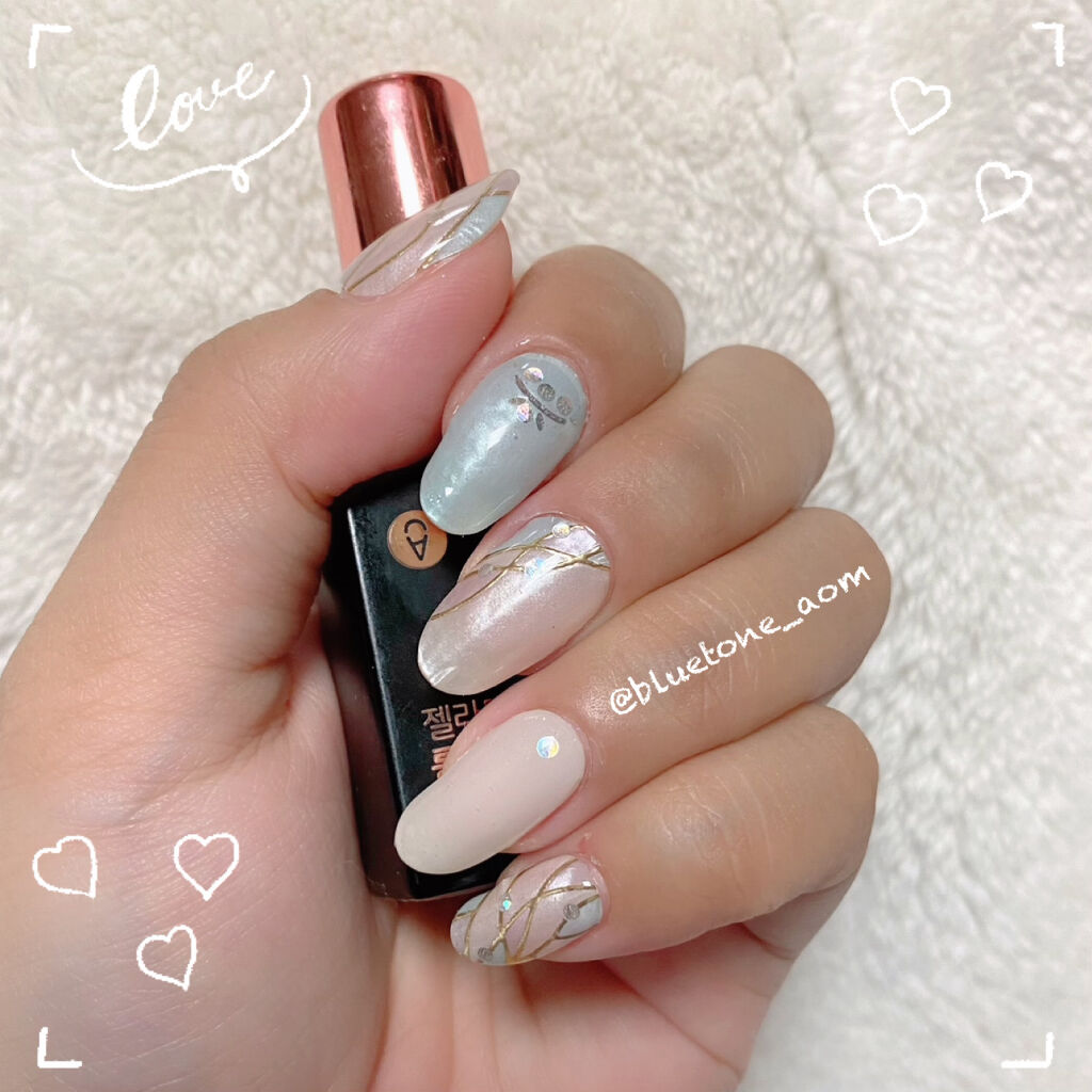 ラメがしっかりしてるし クリアカラーが入ってるから オーロラパウダー無しでも 充分キラキラしました! 反射強めのフィルムなので 実物はもっと うるうるとキラキラが強いです! ビー玉みたい🥺 ネイルシール長持ちさせたいけど ちょっと飽きてきたな〜って時とかに 全然違った印象になるのでオススメです! Seriaのベースジェル 本当にうるうるネイルしやすいので オススメしたい🙆♀️