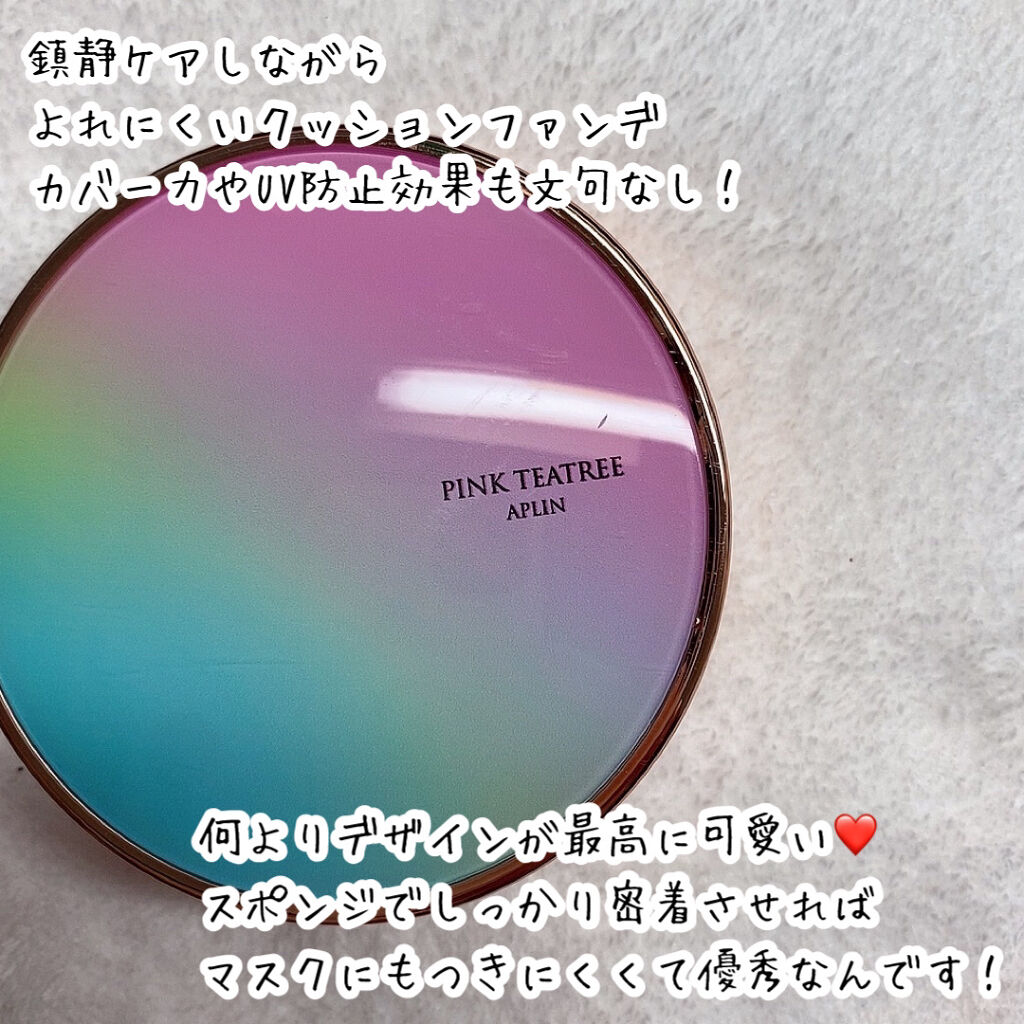 APLIN ピンクティーツリーカバークッション 21号ライトベージュ 2,490円(税込) 少量でよく伸びてハイカバー! 赤みやくすみをしっかりカバ一できるのに、厚塗り感のないなめらかな仕上がり♡ ハイカバーなのにナチュラルなツヤ感とサラッとしつつ、乾燥崩れしにくい仕上がりに感動します!!