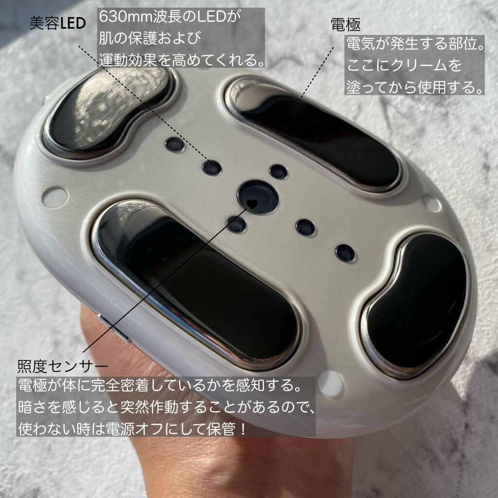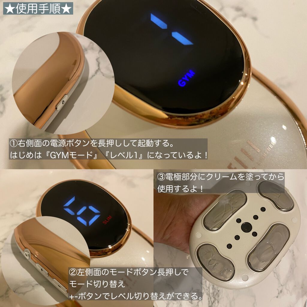 エステで人気のEMS&中周波で深くまで筋肉運動効果とお肌ケアまでも叶う! 白×ピンクゴールドの見た目もかわいく💕 足・腕・お腹・肩・背中どこにでも使えてコードレスなのも︎いいっ⸜👍🏻⸝ 選べる2つのモード&1〜6のレベル調節! 私は初めどちらのモードもレベル1でピリピリジリジリ😲❗️ なんだか痛くすぐったい…? 電気風呂みたいな!? 4週間で美しい曲線が手に入る! なんて😵💫💗 片足10分くらいやるとその日の浮腫もとれているようなっ! 夏に向けてつづけていきます💪🔥 TVやYouTubeを見ながらできちゃうからそんなに頑張んなくていいっ🦖⸒⸒ 効いている感もちゃーんとあるのでおすすめです!