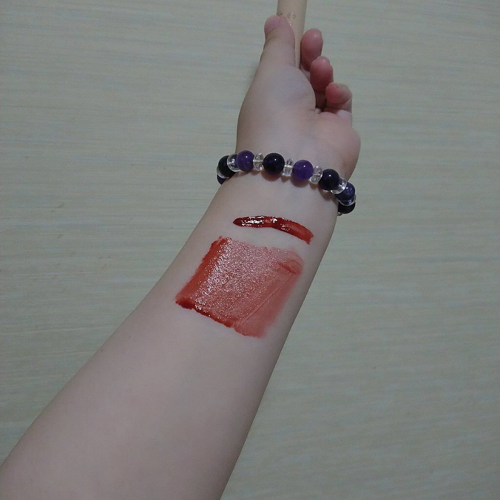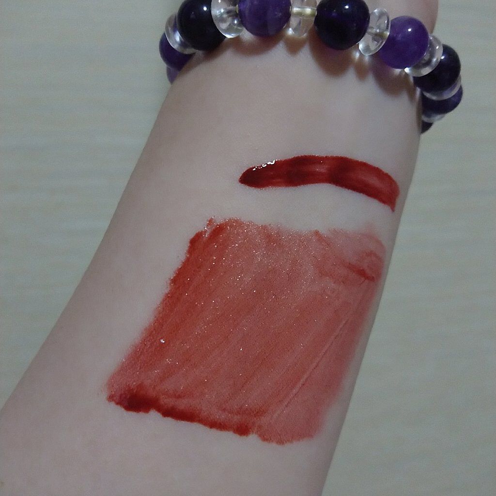 #えりぃのスウォッチです。#ロムアンド#romand#ジュシーラスティングティント22ポメロスキンピンクベージュカラーです。ベージュの中にピンク味があるので、血色感が感じられます。ベースリップとしても!23ヌカダミアポメロスキンより赤みがあり...