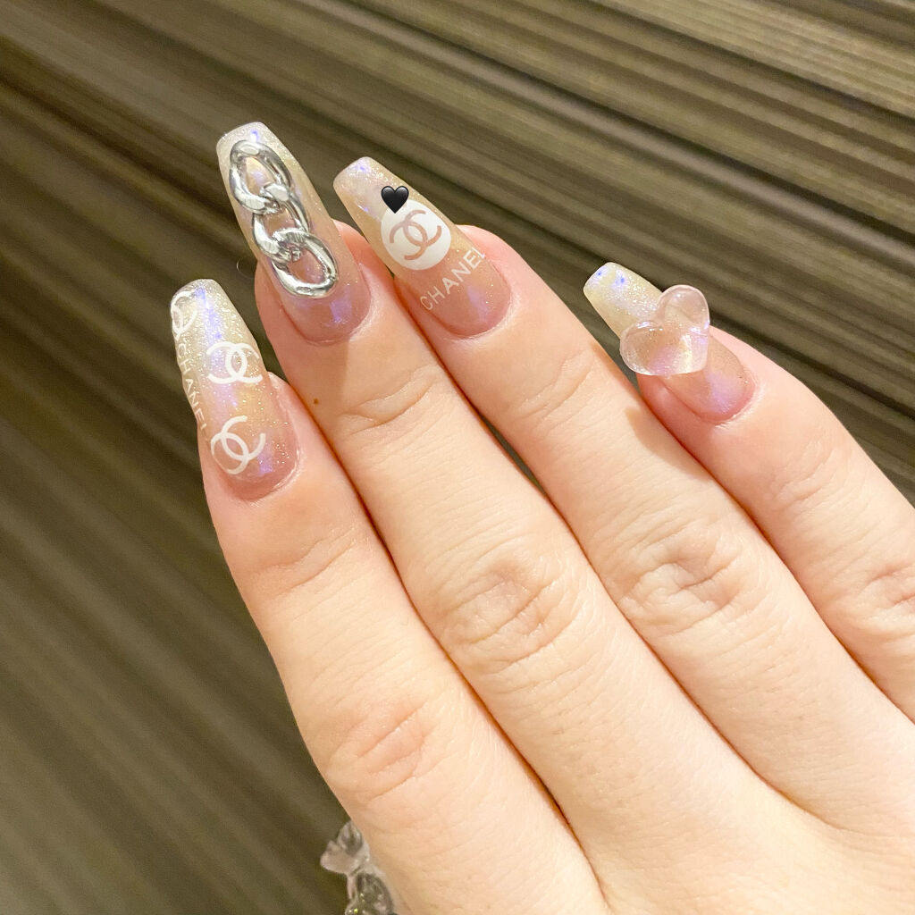 アリエクで買ったCHANELのネイルシールが可愛いいいいい🥺 くまちゃんのシリコンモールドも可愛いいいい❤️🔥 パーツもクリアだとそんなに目立たないしおすすめ🐻❄️❤️🔥❤️🔥 パープルビームは動画じゃないと可愛さが伝えれないから載せてみました🥰