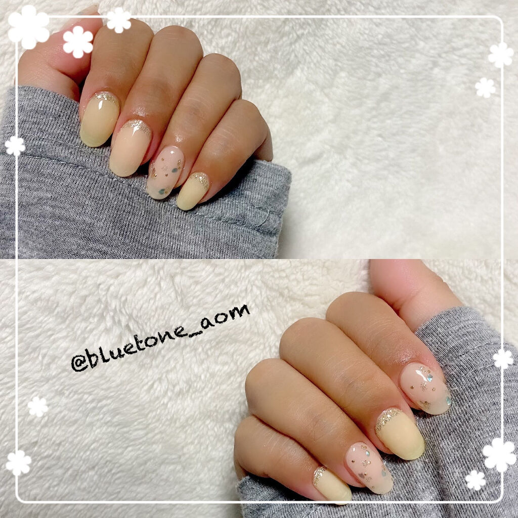 ラメがしっかりしてるし クリアカラーが入ってるから オーロラパウダー無しでも 充分キラキラしました! 反射強めのフィルムなので 実物はもっと うるうるとキラキラが強いです! ビー玉みたい🥺 ネイルシール長持ちさせたいけど ちょっと飽きてきたな〜って時とかに 全然違った印象になるのでオススメです! Seriaのベースジェル 本当にうるうるネイルしやすいので オススメしたい🙆♀️