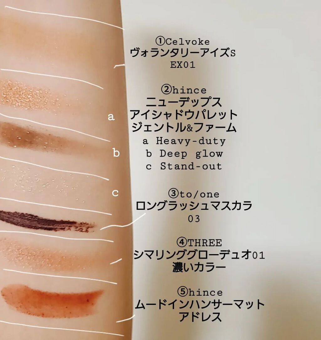 アイブロウは #WHOMEE の#レディモーヴ を。 #celvoke の #ヴォランタリーアイズ Sのアンバーを上下の瞼に指で馴染ませる。 #hince の #ニューアンビエンスカラーアイライナーの#インフューズドを上瞼の黒目上辺りから目尻に掛けて目の際にアイラインを✨ #SNIDELBEAUTY の #フェイススタイリストのa スパークリングゴールドを上瞼の黒目上に。 #SNIDELBEAUTY の #フェイススタイリストのb フロステッドシルバーを下瞼の黒目下に。 #toonecosmetics の #ロングラッシュマスカラ 05を上睫毛だけに付ける。 チークは ⑤③と同じパレットの血色感チークを。 リップは #ヒンス の #ムードインハンサーマットのアドレスを塗る。 #shirocosmetics の #エッセンスリップオイルカラー 0A04をチョチョンと重ねる💋✨ ベージュのアイライナーは抜け感というのかな✨ ゴールドとシルバーのラメは万能です👏