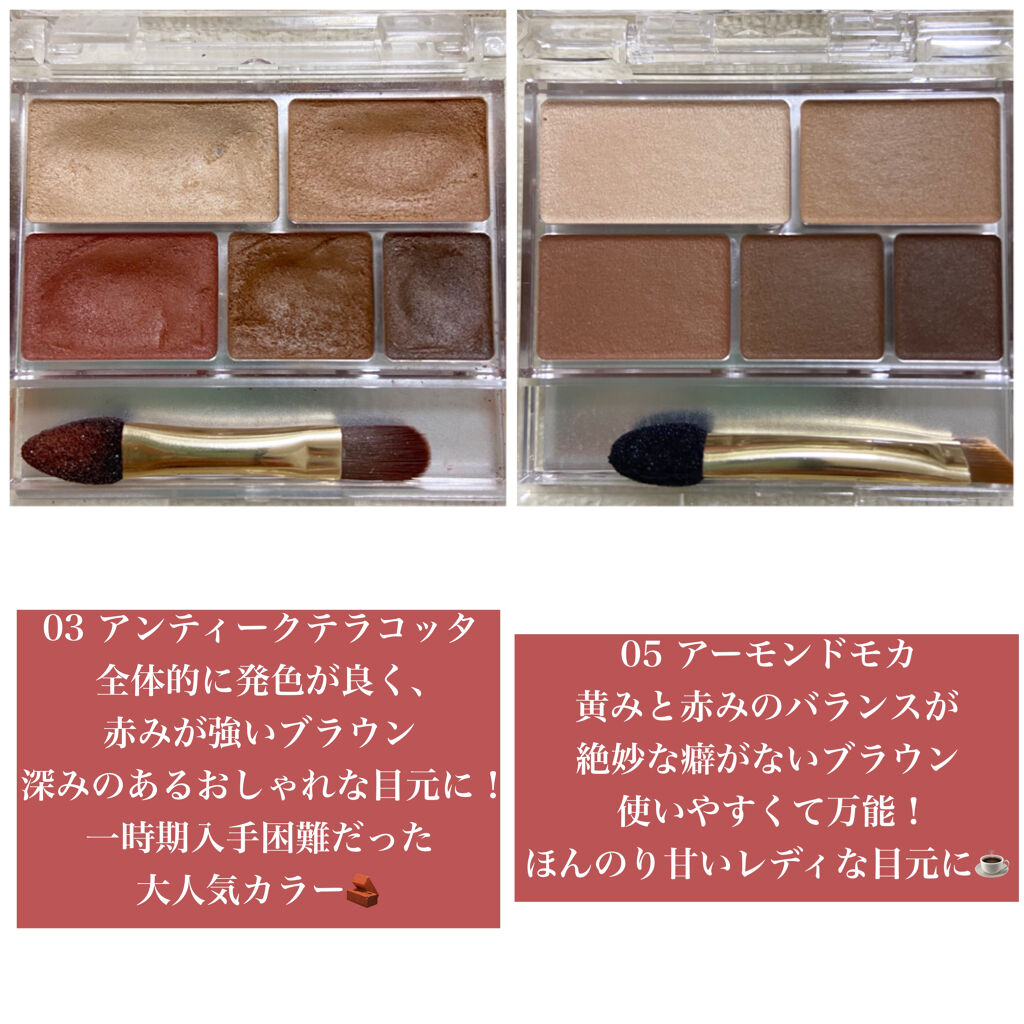 左下のカラーが可愛すぎてずっと迷っていました😳 皆さんのスウォッチを見てみると色味がそっくりで、あんまり違いが感じられないかも…と思いきや、03の方が鮮やかな印象😍 求心顔&面長な私は、目尻と下瞼を中心に左下のカラーを使っています。どちらのカラーも派手すぎず馴染んでくれて、薄メイクの方にもおすすめです◎ 柔らかくて発色も良いプチプラアイシャドウ。まだ試したことのない方は是非チェックしてみてください!