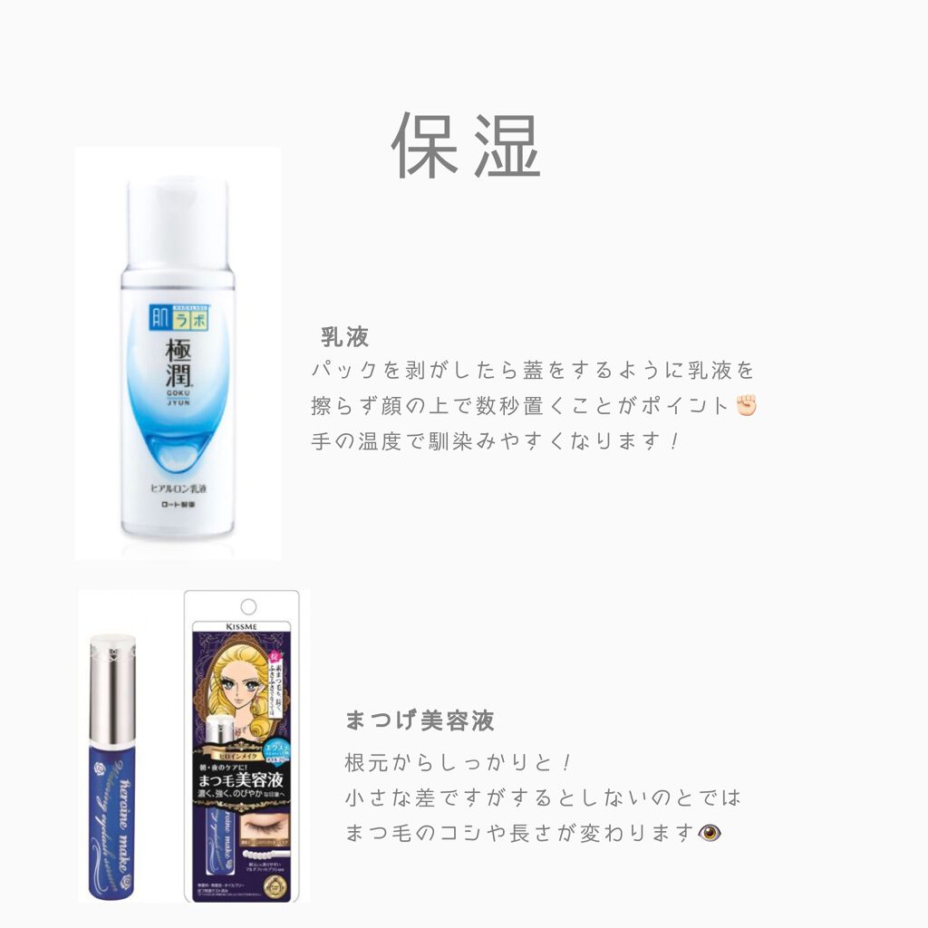 ポイントはしっかり落とすこと、摩擦を減らすこと。 マスカラリムーバーを是非オススメしたい😣 1 拭いたり着たり、そんなことよりも先ず化粧水! パックを待ってる間に洗い流さないトリートメント⇒ドライヤー 数秒顔の上で手を置くことで乳液が温まり浸透しやすくなります! 5 まつげ美容液を根元からしっかりと