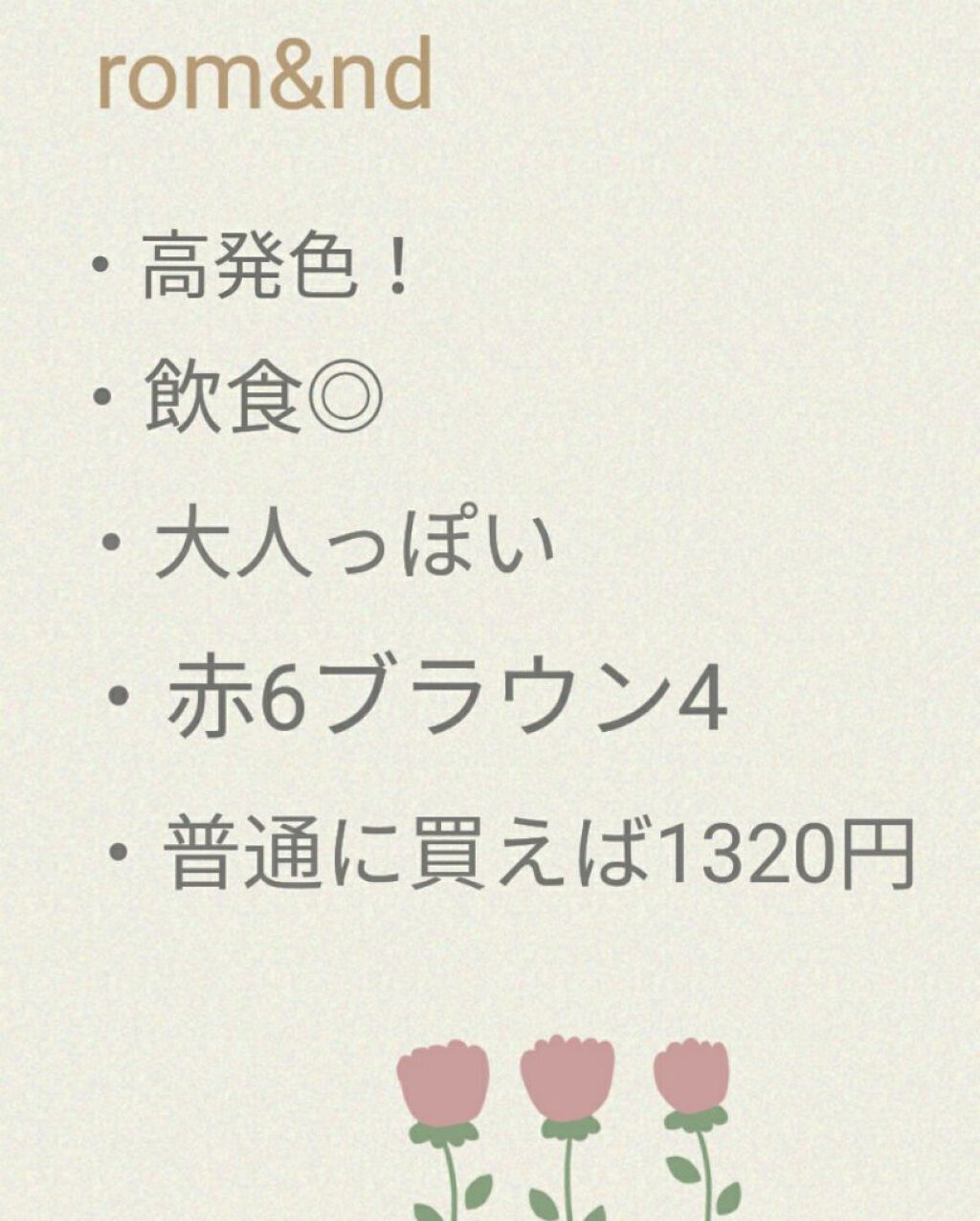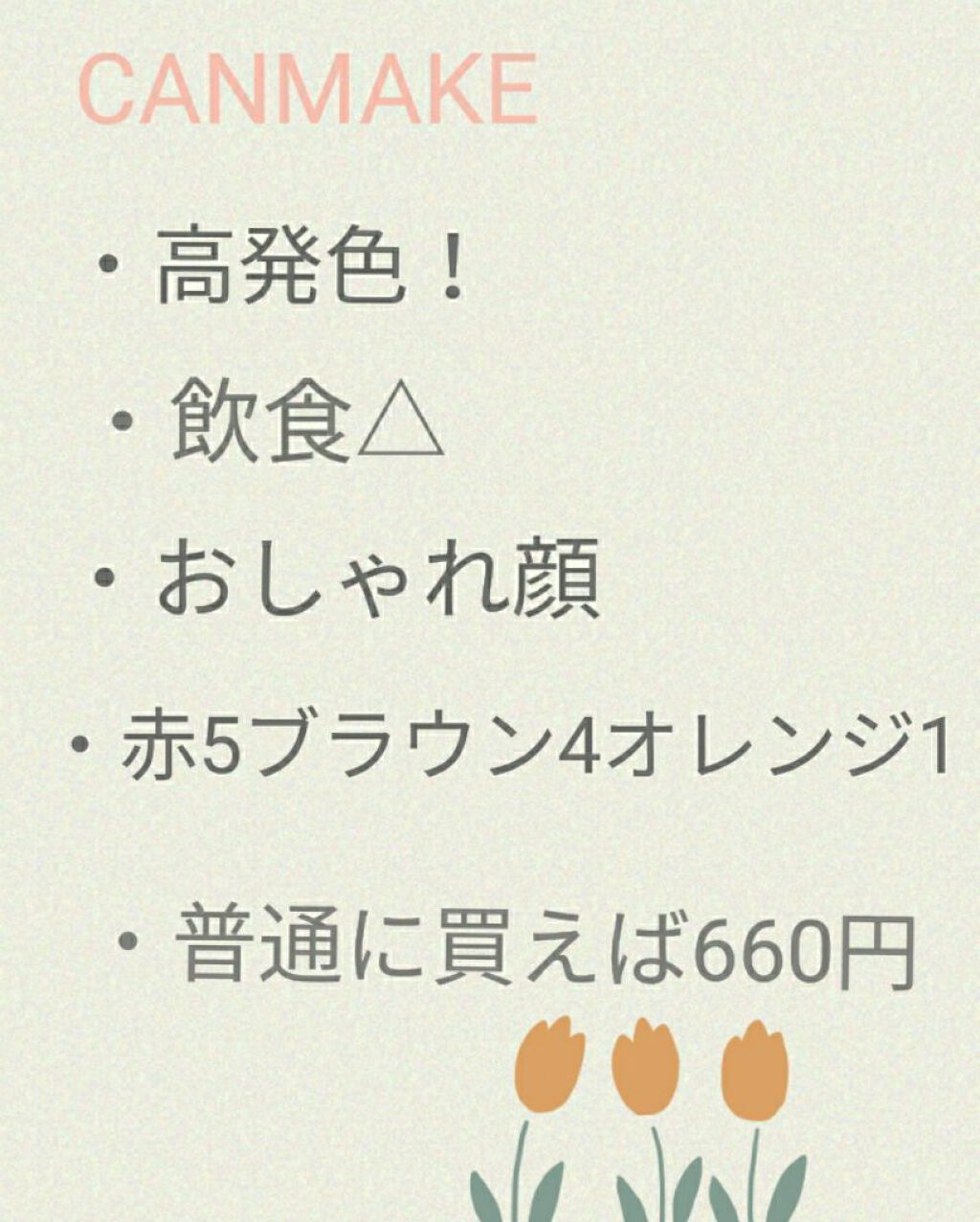 rom&nd・高発色!・飲食◎(コップにつかなかった!)・赤6ブラウン4・大人っぽい!・褒められリップ・1320円 CANMAKE・高発色!・飲食△(コップについた…)・赤5ブラウン4オレンジ1(オレンジ味が少しかかってる)・おしゃれ顔・女子ウケ◎・660円プチプラ!! 共通点・褒められリップ♡・塗る前に保湿リップ塗ってからぬるのがおすすめ