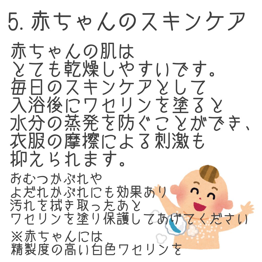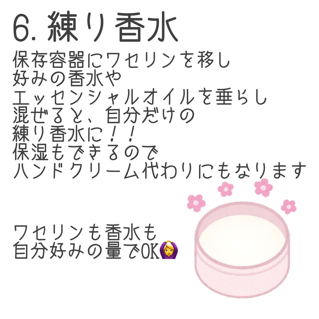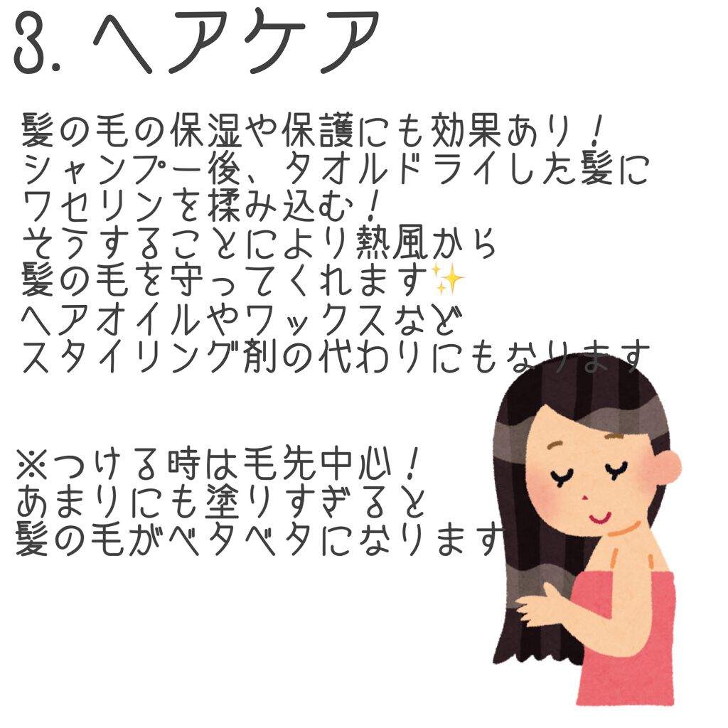 特に私は唇がよく乾燥してしまうので、3枚目の使い方を実践しています👍👍 このワセリン一本あるだけで、こんなにも使い道があるのだなとびっくりしました そして顔に使う場合は精製度の高い白色ワセリンを使用してください☝️