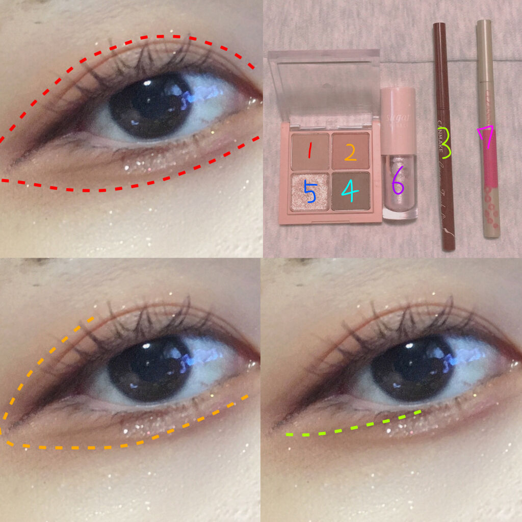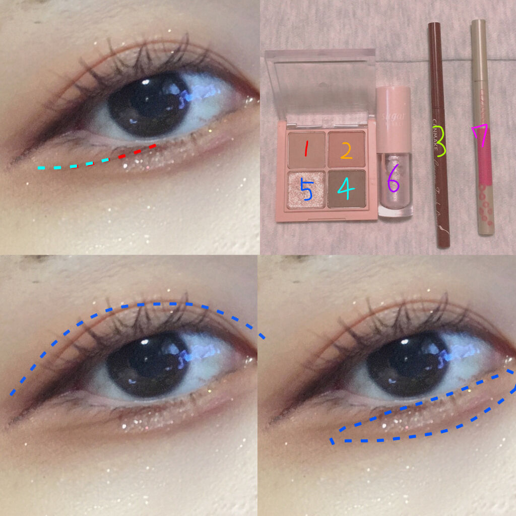 アイシャドウ👀・CLIOプロ アイ パレット01SIMPLY PINK グリッター✨・PERIPERAデュオ ポケット グリッター シャドウ03SALTED SUGARPLUM 涙袋のコンシーラー👧・キャンメイクカラーミキシングコンシーラーオレンジベージュ マスカラ💇♀️・rom&ndハンオールフィックスマスカラL02LONG ASH アイライン✏️・キャンメイククリーミータッチライナーダークブラウン・CEZANNE極細アイライナーEX20ブラウン