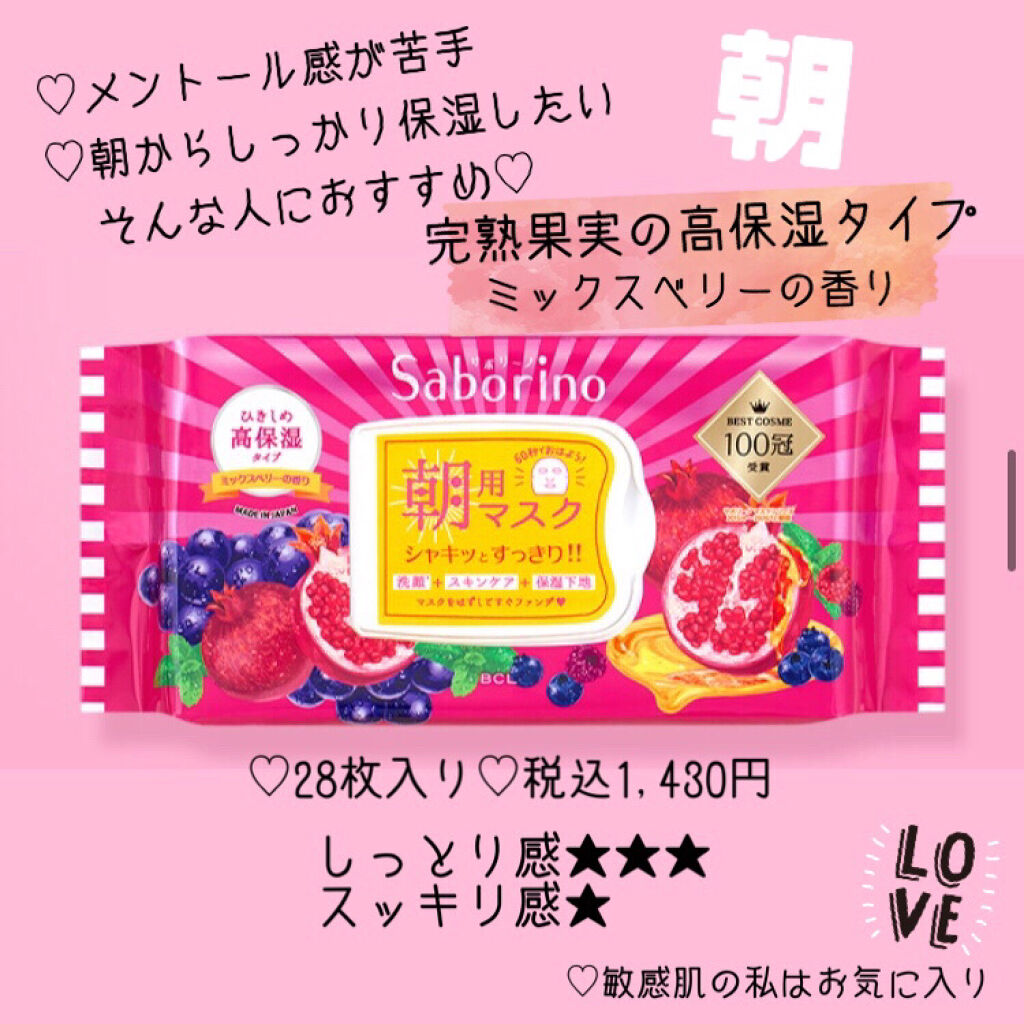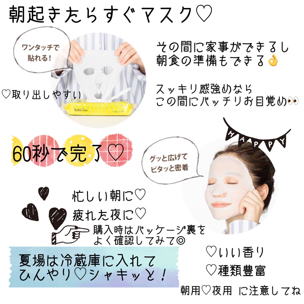 🍎🍒 Saborino🍒🍎※写真は公式サイトさんからお借りしました※現在販売されていない商品もあります。公式サイトやSNS等でご確認ください。♡時短スキンケア♡サボりたい時に オススメなサボリーノの☀️朝用マスク🌜夜用マスクたまに「いまい...