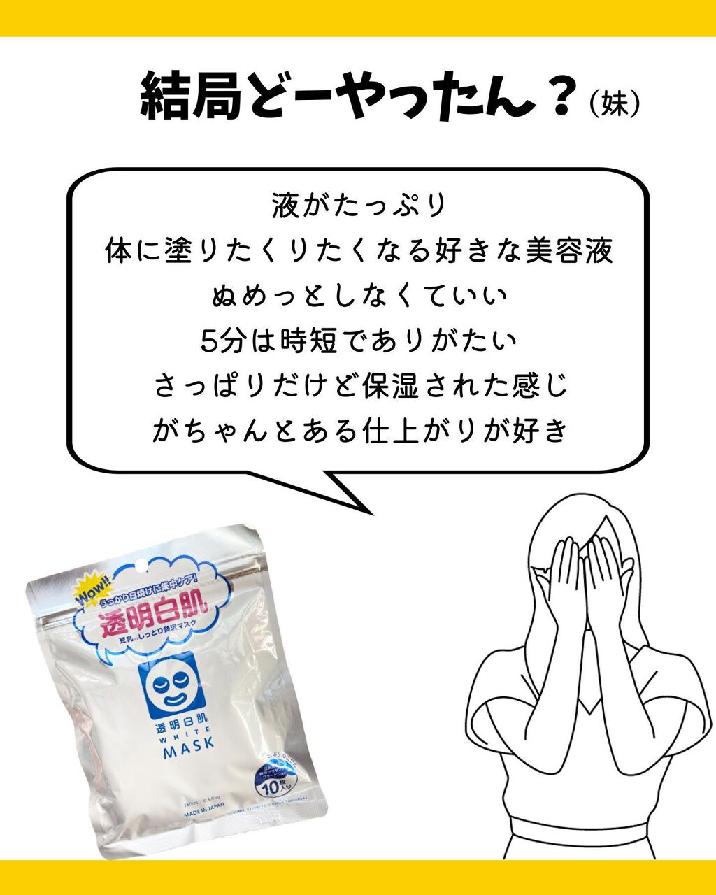 - <ホワイトマスクN> 水、グリセリン、BG、エタノール、ヒアルロン酸Na、加水分解コラーゲン、豆乳発酵液、クズ根エキス、クロレラエキス、アロエベラ葉エキス、ユキノシタエキス、ボタンエキス、ダイズ種子エキス、クエン酸、クエン酸Na、キサンタンガム、(スチレン/VP)コポリマー、ポリソルベート80、メチルパラベン、フェノキシエタノール