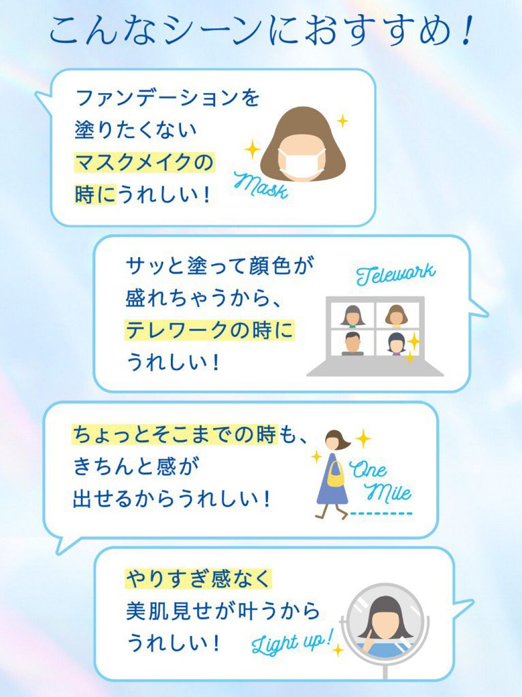 使用感 ベタベタせず塗りやすい 良いところ 見た目がかわいい 透明感アップする 美肌見せが叶う 顔色が盛れる ファンデーションのかわりに使える イマイチなところ キラキラ✨するので学校ではあまり使えないかもしれません どんな人におすすめ? 自然に透明感アップしたい ベタベタが苦手 白浮き,色ムラが気になる 美肌に見せたい 顔色を良くしたい ファンデーションの変わりにしたい