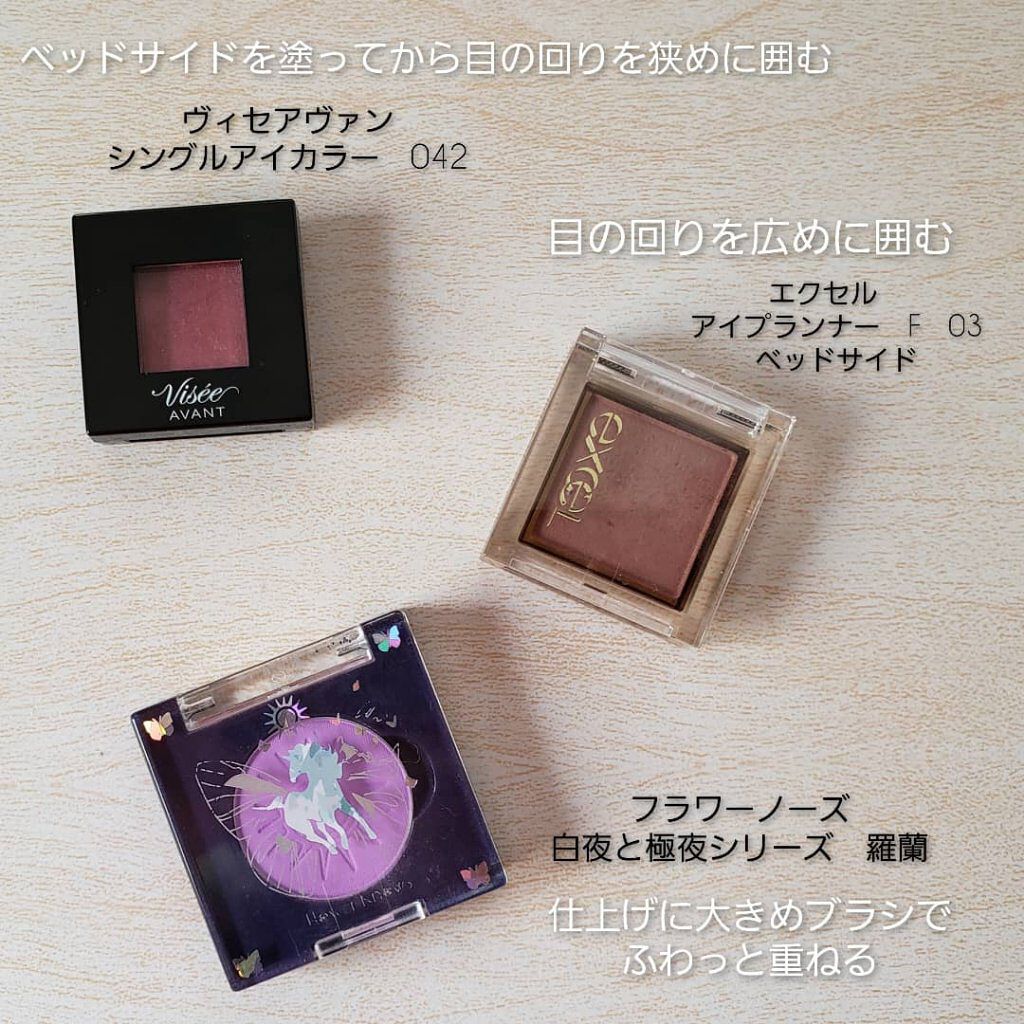 ✔️しっとり粉飛びもなく粉質良かったです。 ✔️1つ目のメイクは色味が分かりやすいように単色グラデにしました 大きめブラシでふわっとアイホールに 二重幅は指塗りです☝️⤴️ 濃さで雰囲気が変わって色々楽しめます。 ✔️紫みもダークさも感じさせる深いカシス色で紫みがあることで恐らくブルベ?の私の肌色に馴染んでとても使いやすい赤でした🙌 ✔️細かくゴールドぽいラメが入っていて控えめにチラチラと輝いて綺麗です ✔️発色がとても良かったです 色持ちもよくて二重幅にも溜まらず プチプラとは思えないクオリティでした🙈 ✔️#アディクション#ノスタルジア も紫みを感じるブラウンなので 色合いがうまく調和したな、と思いました よりダークさが出てお気に入りです🙈⤴️⤴️ ✔️仕上げに#フラワーノーズ#白夜と極夜シリーズ#羅蘭 をふわっと重ねると透明感とさらに肌馴染みの良さが出て良きでした🙆