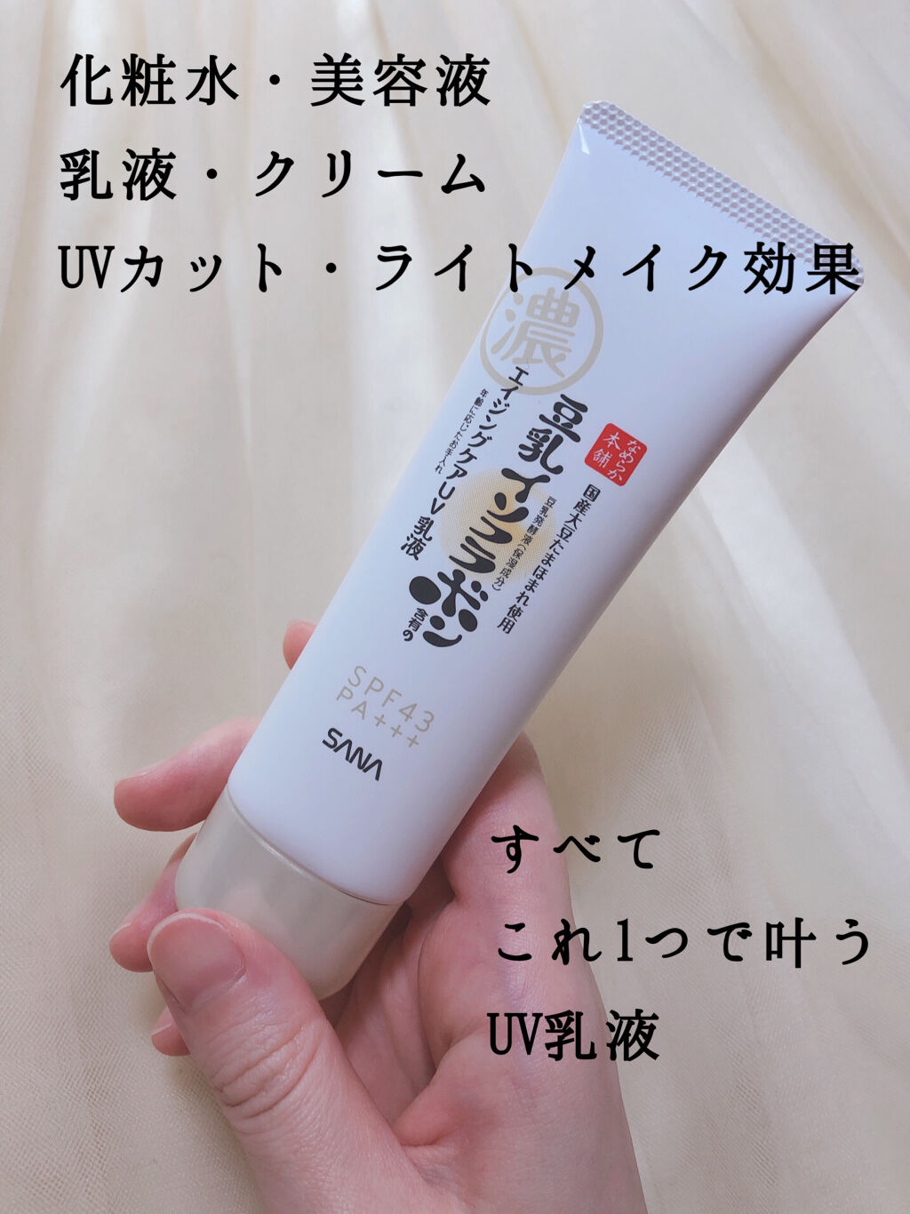 - ほうれい線・小じわのメイクよれが気になる方におすすめの日中用カバーUV 乳液です。リニューアルしたなめらか本舗エイジングケア*1ライン共通の、滋賀県産たまほまれ使用の豆乳発酵液*2とピュアレチノール*2を配合しています。リンクルリフレクト効果で、ほうれい線や小じわを目立たなくし、時間が経ってもメイクよれが気にならない処方を採用しました。お肌にうれしいノンケミカル(紫外線吸収剤不使用)処方で、洗顔後これ 1 つでスキンケアからベースメイクまで完成。 乾燥による小じわを目立たなくします(効能評価試験済み)。 SPF43・PA+++、石けんでオフできます。 *1年齢に応じたお手入れ *2保湿成分