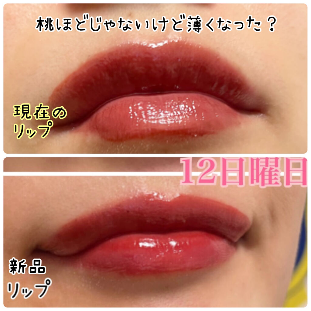 可愛くてみずみずしくて大好きなティントなんですが、、、 変色するのは2度目なんですが、かわいい色の11桃が特に変色しやすく、ベージュのような色に。 12日曜日も若干色味が薄くなった気がしますがそこまで大きな変化はありません。 桃はかわいい粘膜色でとっても気に入っていたけど流石に1ヶ月で変色しちゃうなら再度3度目のリピートはないかなって感じです。