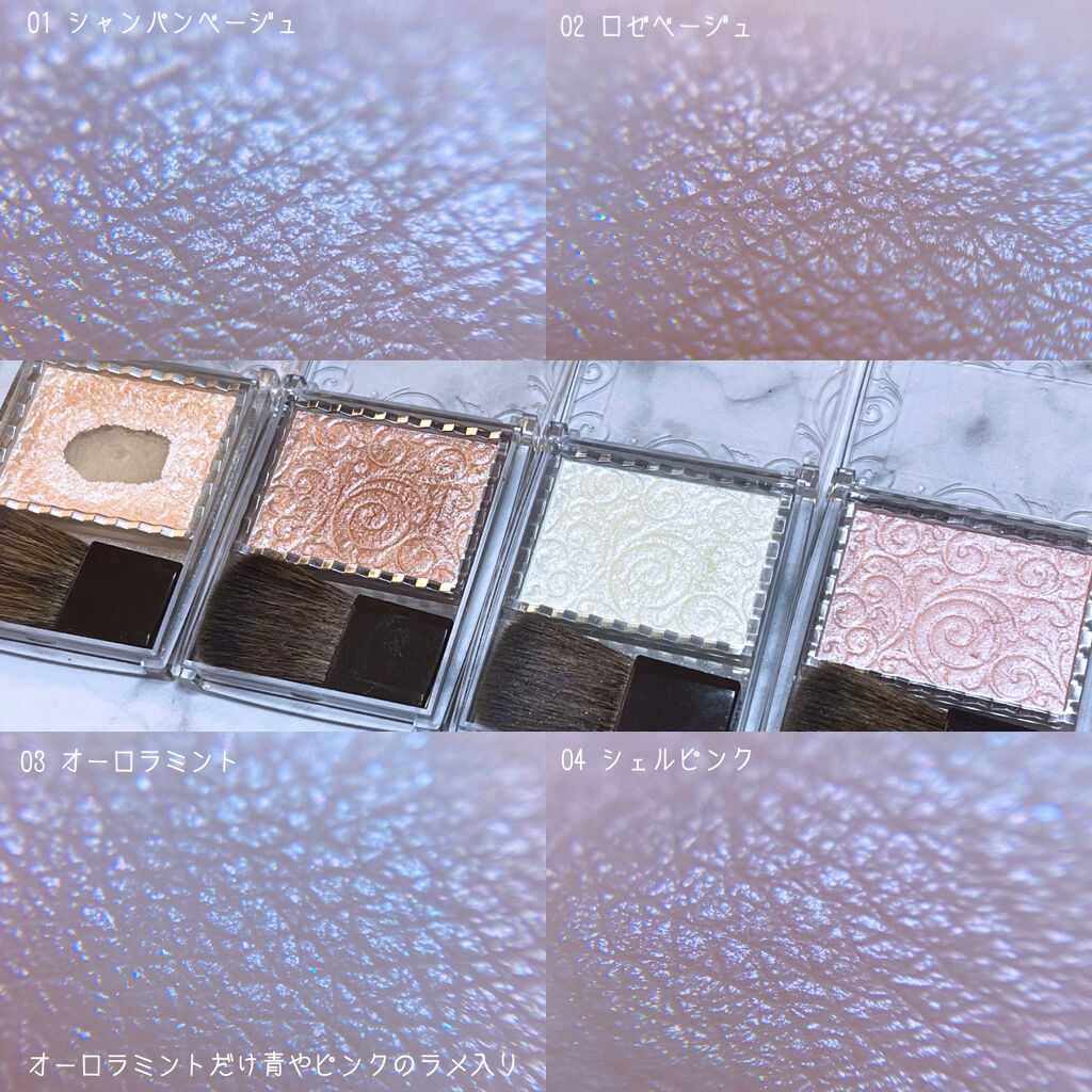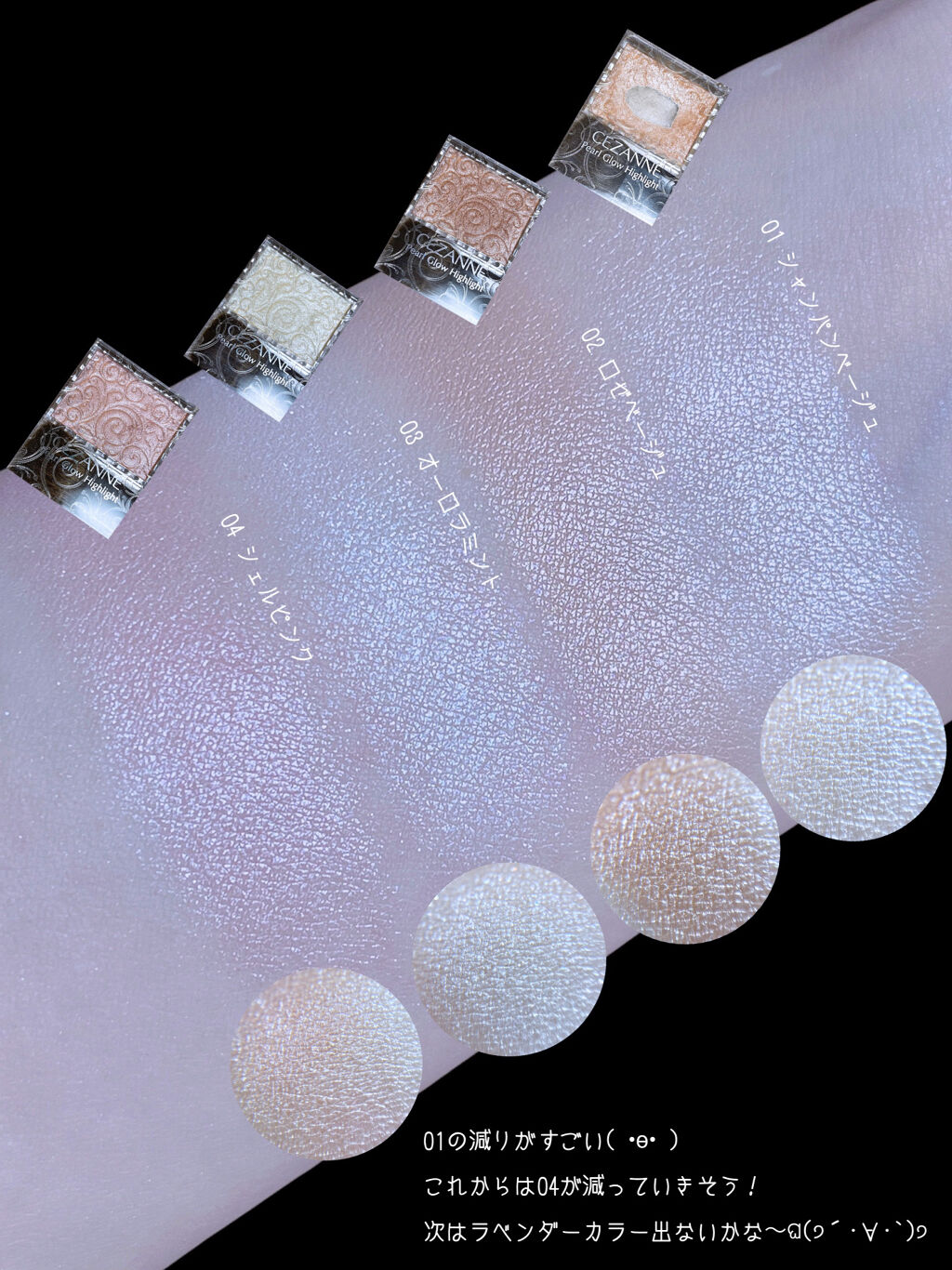 プチプラだとは思えないほどキラキラする綺麗なハイライト。ひとつ持っていて損はありません! オーロラミントは、肌につけると緑感はあまりなくて、透明感を出しながら発光してくれます。 シェルピンクはナチュラルに血色感も出しつつ馴染むカラーです