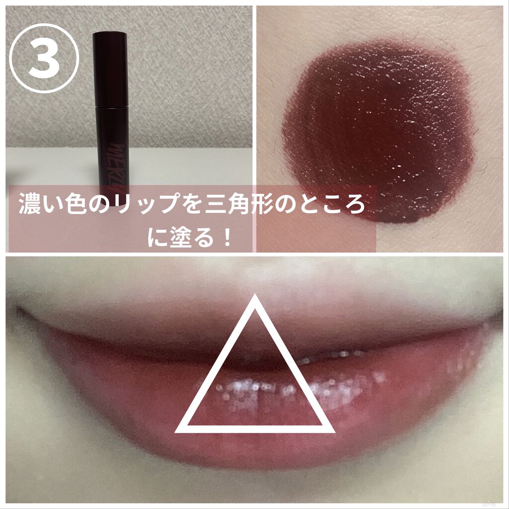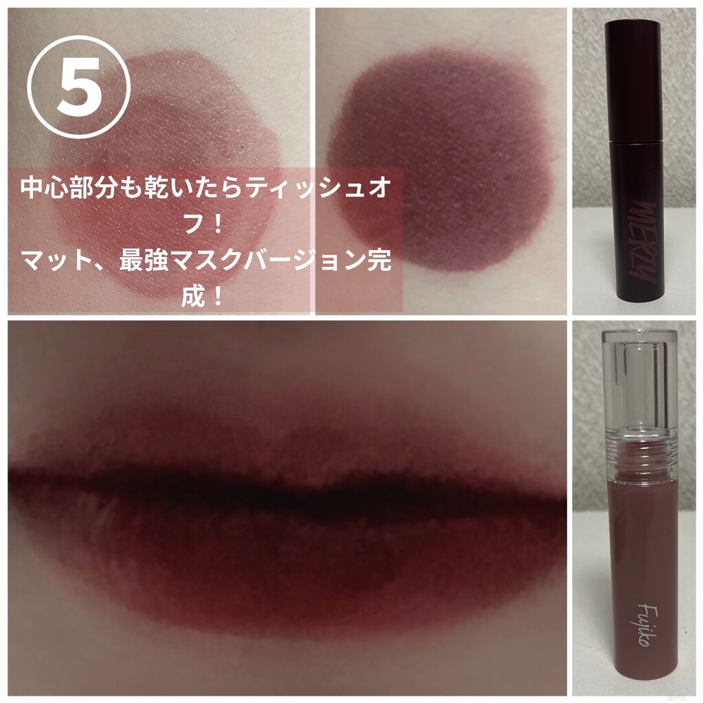 自分の手持ちのティント2本で、できるのですが、一応今回私が使用したティント2本を紹介します! ・Fujiko ニュアンスラップティント 101 無花果レッド プラザ限定カラー ・MERZY バイト ザ ビート メロウ ティント M4. ビアンローズ ♡やり方♡ 1⃣自分の好きな形にⅰのティントを塗る! 2️⃣ティントが密着したな〜と思ったらティッシュオフ! 3️⃣ⅱのティントを上唇と下唇で三角形になるように塗る! 4⃣んまんましたらプルっとティントVer.完成! 5️⃣ⅱのティントが乾いたらティッシュオフ!