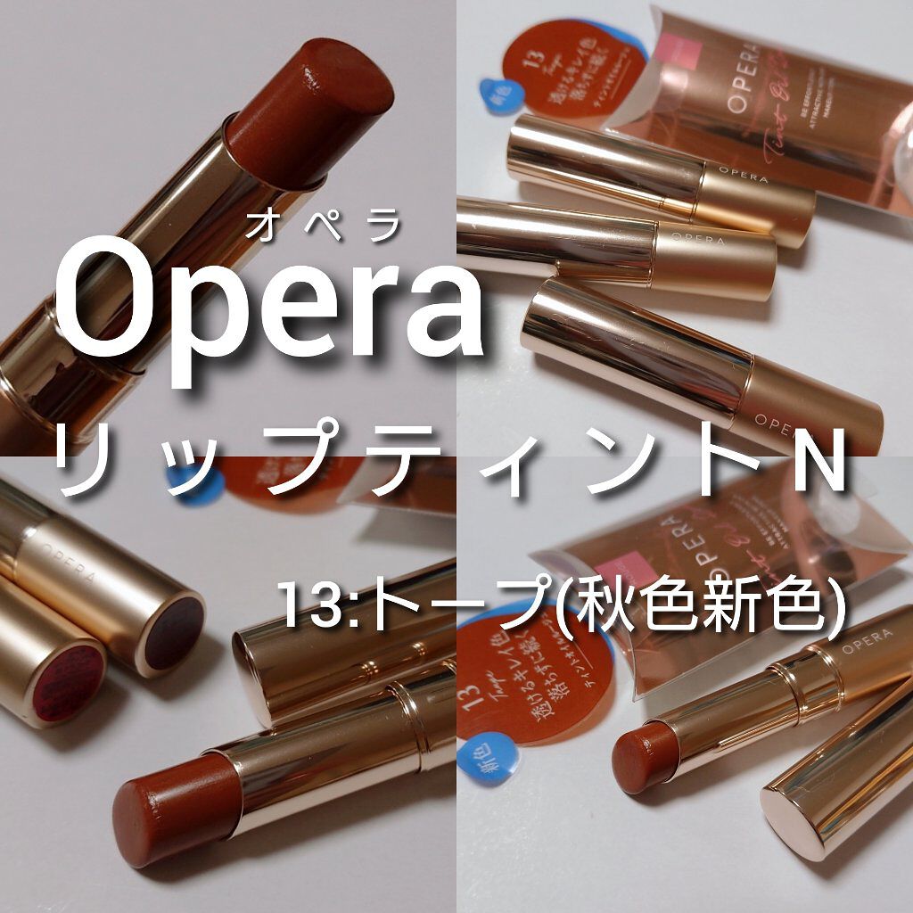 オペラ リップティントN 13トープ 最近暗髪にしてブラウンメイクをよくするのでトープを選択︎⸜❤︎⸝ こちらはオレンジ強めのブラウン! 美容オイルが入っているからか、するすると塗れてオイル感があって保湿リップしなくても1本でツヤツヤに✨️ 色持ちとツヤ感はめっちゃいいです◎ 濃すぎず薄すぎなくてムラになりにくいから塗り直ししやすいのもオススメ♡