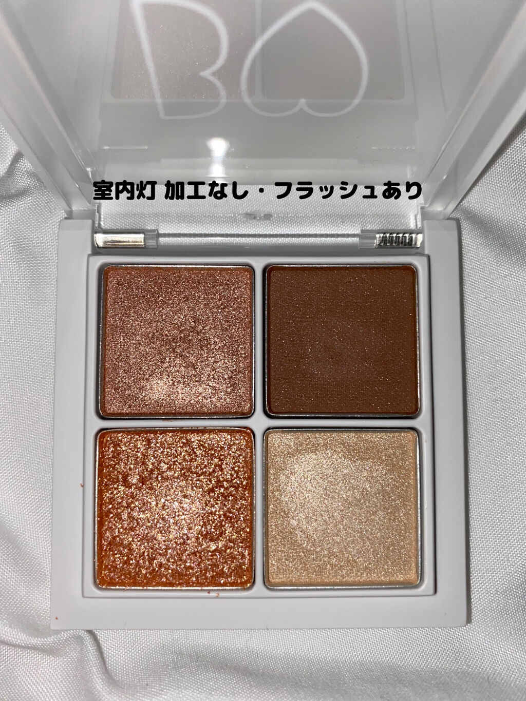 正直に言って、ここまで捨て色がないアイシャドウにははじめて出会いました…💓 左上のベージュブラウンカラーは細かいラメでツヤ感があり、とにかく可愛い。 右上マットな締め色ブラウンは濃すぎず絶妙なカラーで二重幅にもラインのぼかしにもすごく使いやすい! 左下グリッターは見た感じはオレンジが強いけど、塗ると薄い色付きでラメが綺麗にのってくれて目元を華やかにみせてくれます。 右下のハイライトカラーも白すぎず、ゴールドすぎず肌になじみ、綺麗で自然な発色で使いやすいです。 このアイシャドウを持っておけば間違いないってくらい全人類におすすめしたい!!🌟