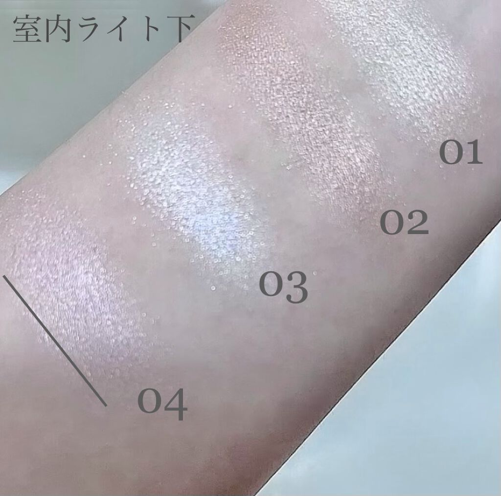 まさに求めていたピンク系です♡⃜ 02番ロゼベージュがブロンズ系でなかなか使うのが難しかったのですがこちらはとても使いやすい薄めのピンク♡ 瞼にツヤを出したい時や涙袋をぷっくりさせたい時にもぴったりでした♪ 発光の強さでいうと01番よりは控えめな印象。 スウォッチ写真はわかりやすいように指でかっつり塗っています。ブラシで使用すればとても自然な仕上がり◎