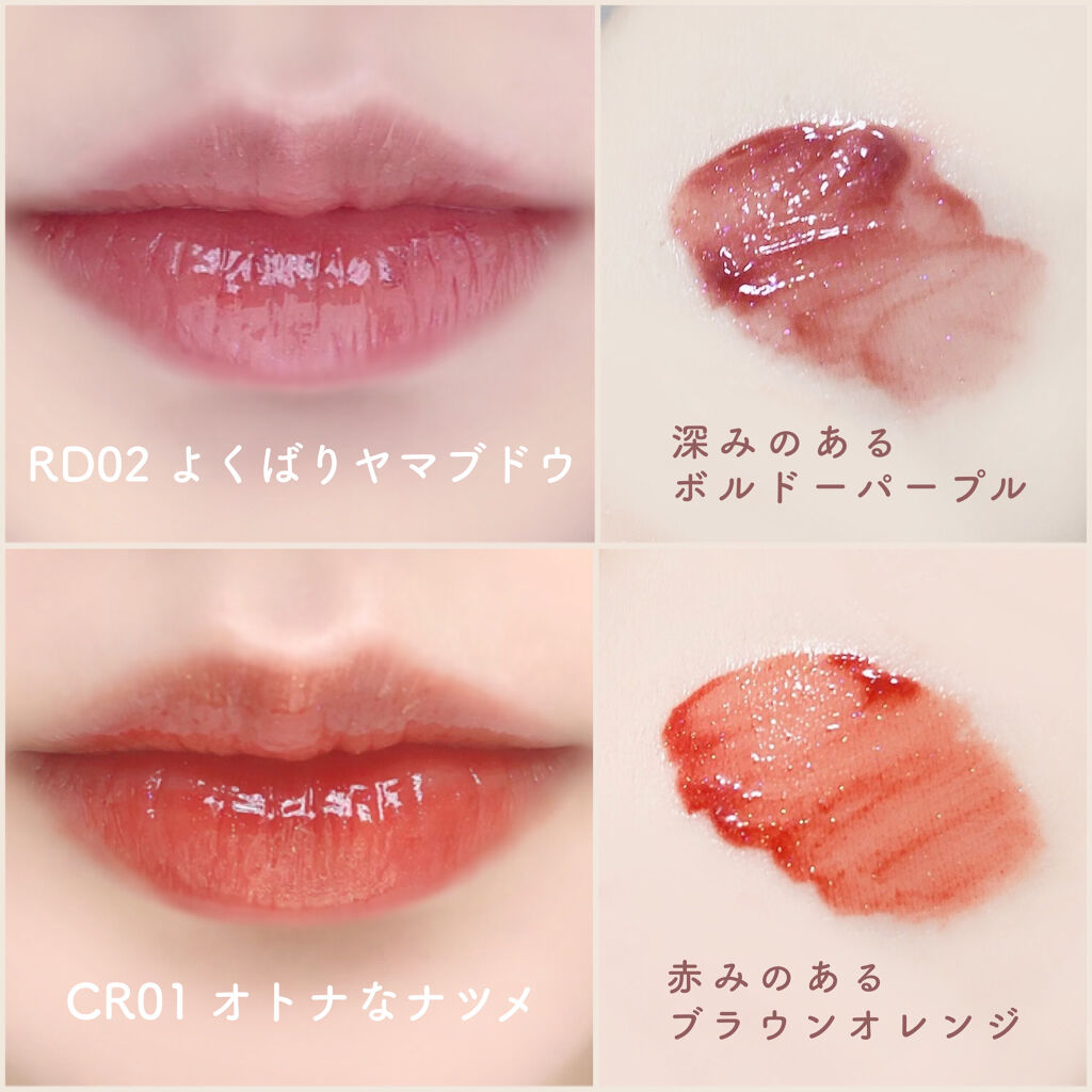 - Point 1 ジューシーなもぎたて果実のような発色が長時間続く Point 2 キラキラ輝くスパークリングジュエリーパウダー配合 Point 3 リップケアオイル配合で、クリアな光沢感のある仕上がり RD03、CR02は公式オンライン限定発売