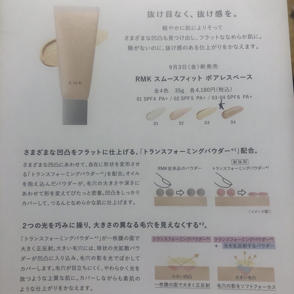 - “毛穴を隠すのではなく、見えなくする*1 ”、RMKの新メイクアップベース。 気になる毛穴やニキビ跡などのさまざまな凹凸にあわせて、変幻自在に形を変える「トランスフォーミングパウダー*2」を配合。 まるで肌と一体化するような一枚の薄膜ヴェールで覆われた、つるんとなめらかな肌に仕上げます。 さらに、思いのままに光を操ることで、ふんわりとした明るさを引き出し、毛穴の目立ちにくい 透明感あふれる肌に。 スキンケア成分配合でしっとりとしたうるおいを感じながら、軽やかでなめらかなテクスチャーが肌にのび広がり、なじんだ後はさらっとしたハーフマットな仕上がりに。 凹凸だけをフラットにするノーカラータイプから、ナチュラルに肌の色をととのえたり、トーンアップさせるカラーまで、自由に選べる4 色のラインナップです。 *1 メイクアップ効果 *2 ジメチコンクロスポリマー、ジメチコン(感触向上剤) 01 SPF4 PA+ / 02 SPF5 PA+ / 03・04 SPF6 PA+