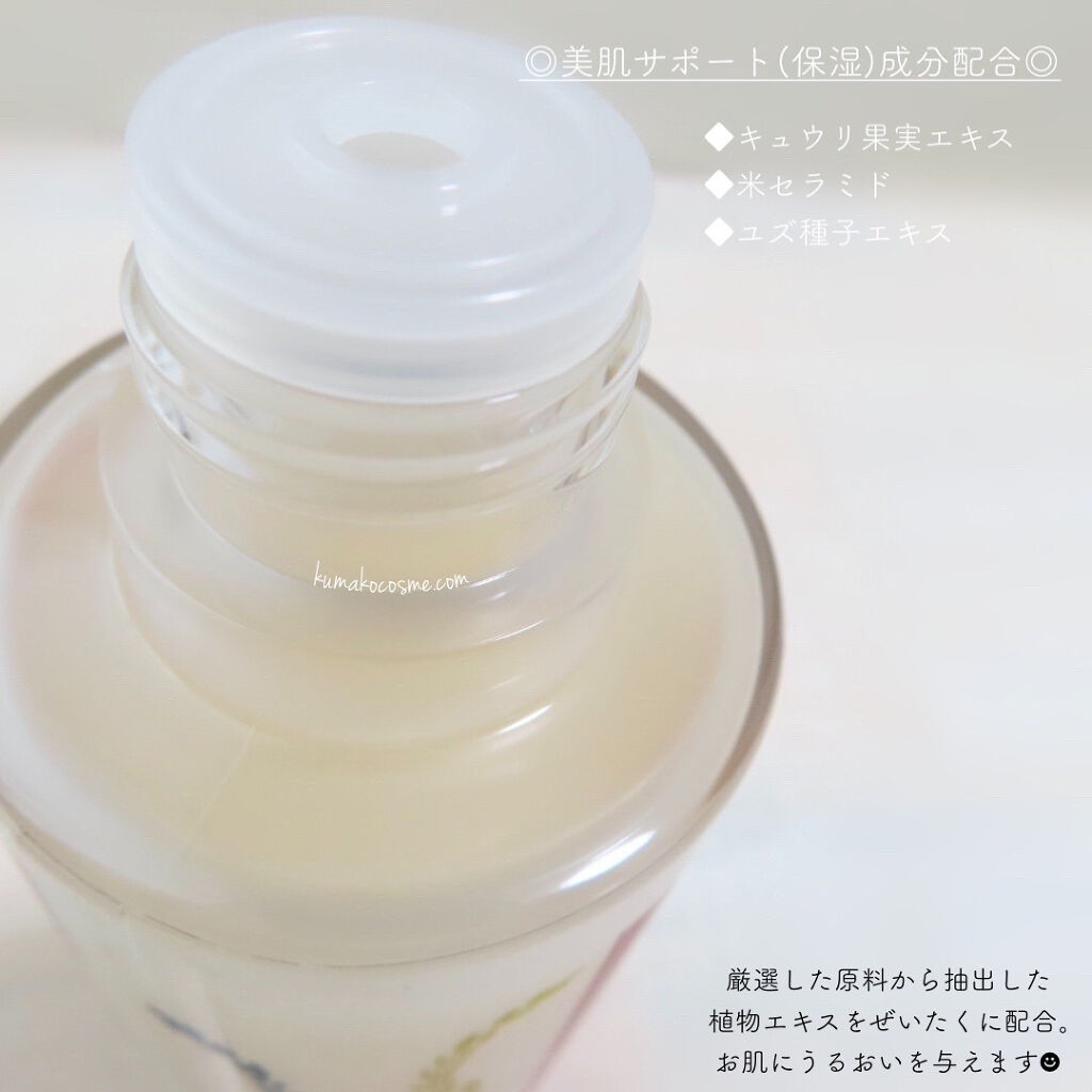 - <190ml> 水、DPG、グリセリン、トリエチルヘキサノイン、ペンチレングリコール、ビスPEG-18メチルエーテルジメチルシラン、酒粕エキス、コメ発酵液、加水分解酵母エキス、キュウリ果実エキス、コメヌカスフィンゴ糖脂質、ユズ種子エキス、ヒアルロン酸Na、加水分解ヒアルロン酸、加水分解コラーゲン、水溶性コラーゲン、ツルレイシ果実エキス、コシロノセンダングサエキス、異性化糖、水添レシチン、リゾレシチン、(エイコサン二酸/テトラデカン二酸)ポリグリセリル-10、ラウロイルグルタミン酸ジ(フィトステリル/オクチルドデシル)、イソステアリン酸ポリグリセリル-4、イソステアリン酸ポリグリセリル-10、クエン酸、水酸化K、水酸化Na、カルボマー、ヒドロキシプロピルグアーガム、BG、イソステアリルアルコール、トリ(カプリル酸/カプリン酸)グリセリル、エタノール、マロン酸ジエチルヘキシルシリンギリデン、カラメル、フェノキシエタノール、香料