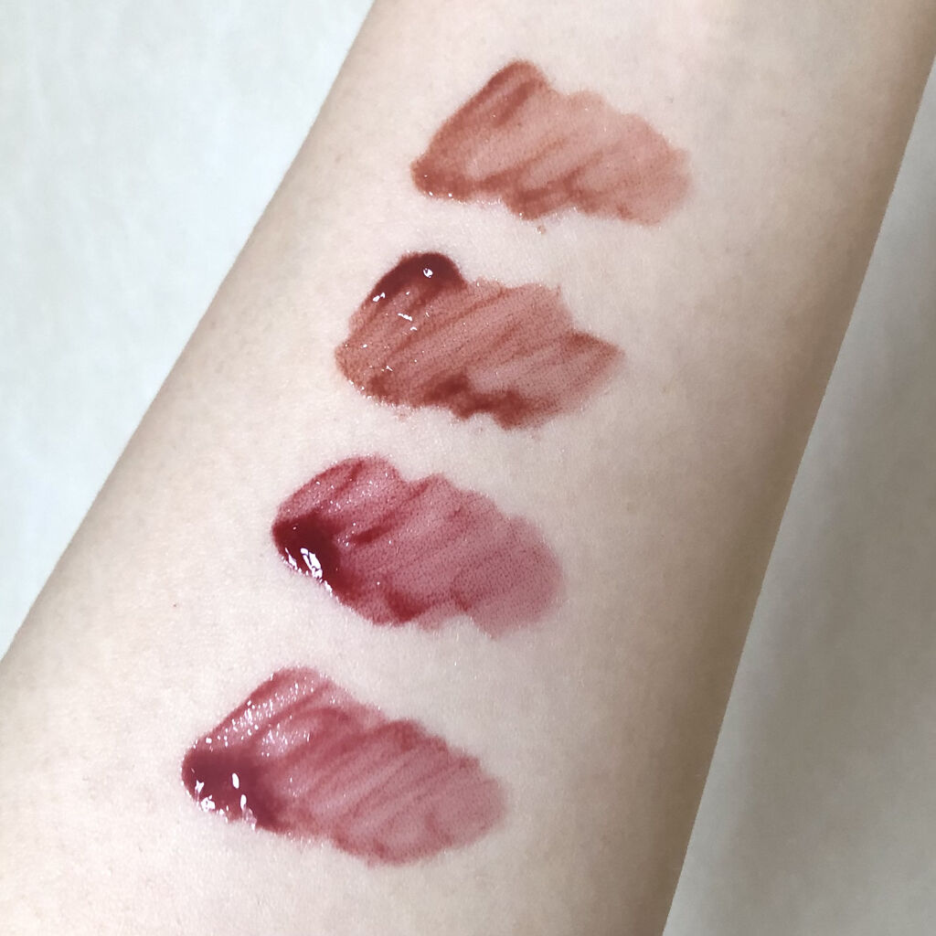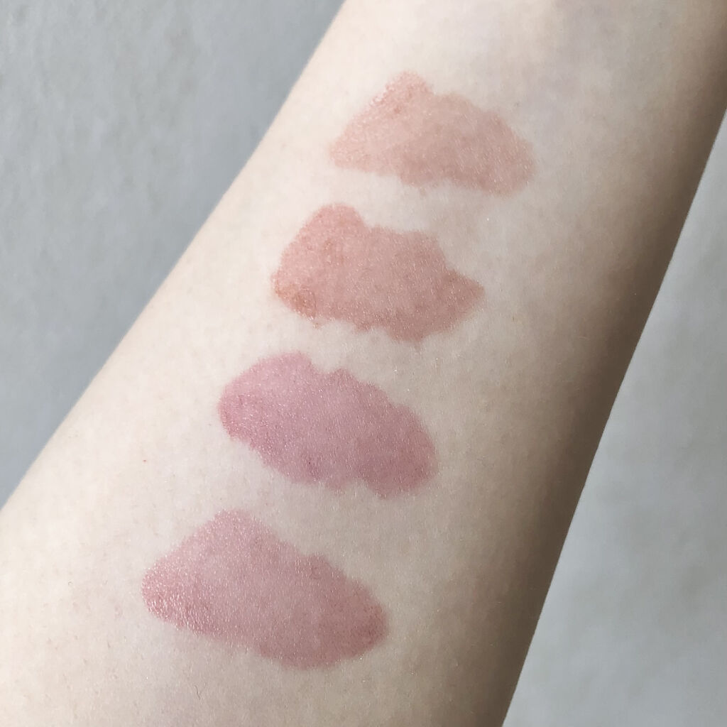 適度に白みが入ってるので、素の唇の色ムラを綺麗に補正してくれる ポメロスキンは唇にのせると淡いピンクベージュのように発色し、特にヌカダミアはブルベのためのヌードレッドブラウンって感じでブルベの私でもめちゃくちゃハマりました🥺✨✨ ピーリングエンドゥは4色の中で1番彩度が高く、フィグフィグから少し青みを抜いた感じの色味です。 そして大人気のベアーグレープはブルベさんなら無条件に買うべき最高に可愛いヌード青みピンク♡