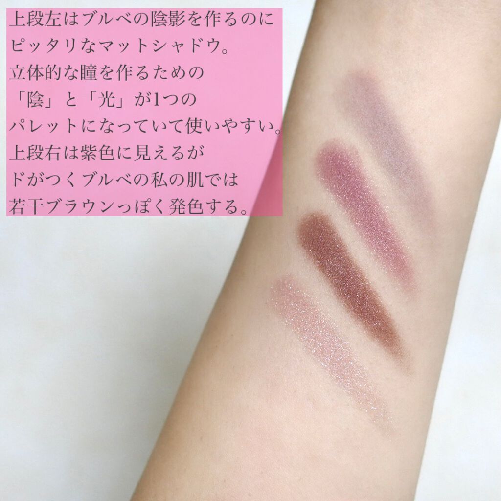 上段左はブルベの陰影を作るのにピッタリなマットシャドウ。ノーズシャドウまでこなせる。 立体的な瞳を作るための「陰」と「光」が1つのパレットになっていて使いやすい。 上段右は紫色に見えるが、ドがつくブルベの私の肌では若干ブラウンっぽく発色する。青み吸収というものです。 ブルベ冬にはくすみが強いので下段メインで使う方が良いかも。