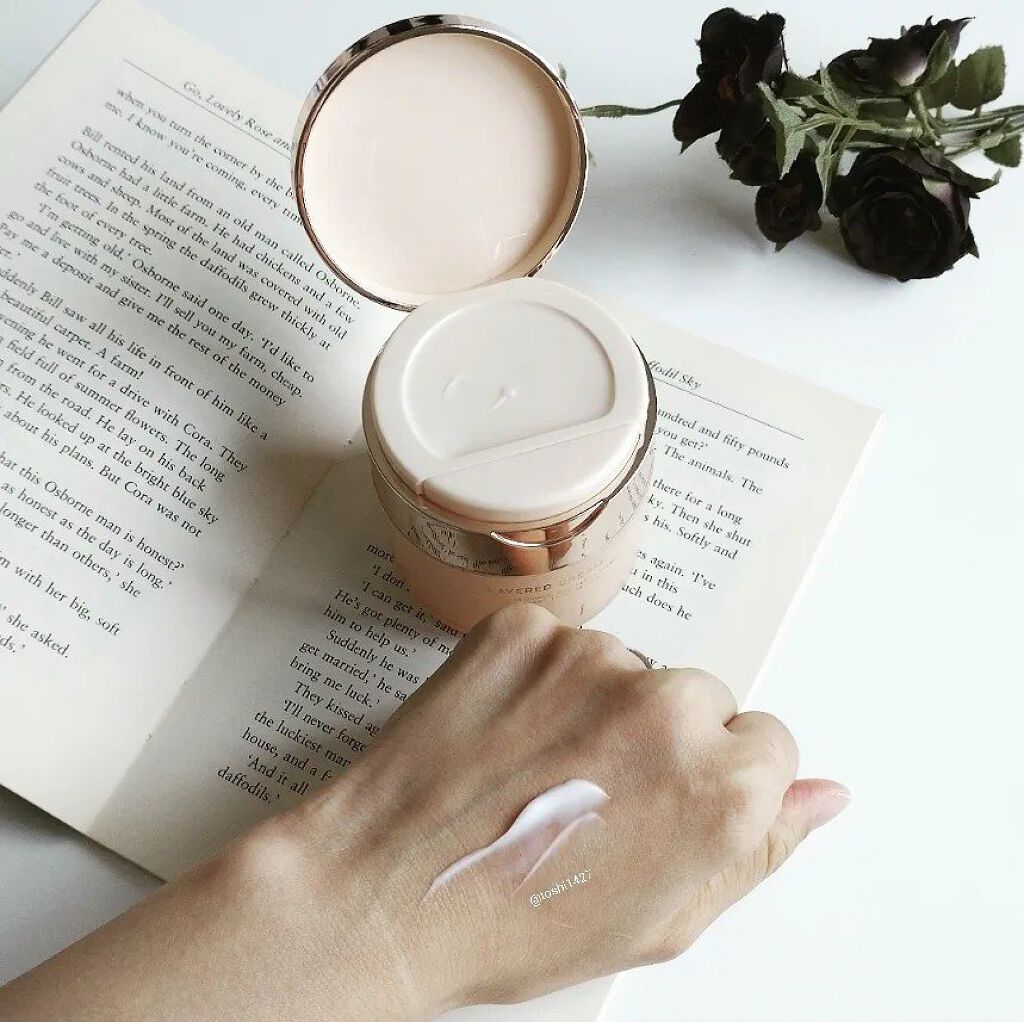 一度に厚く塗るの禁止!!時間を置いて重ね塗りするレイヤードクリーム ヒト幹細胞培養液、ヒアルロン酸7種、アミノ酸17種配合。 エアーレス容器になっていて、プッシュするとクリームが出てきて衛生的に使える。 薄ピンクのクリーム。伸びが良いテクスチャー。ベタつきはなし。肌の状態を整えくれる朝晩使いやすい保湿クリーム🌷