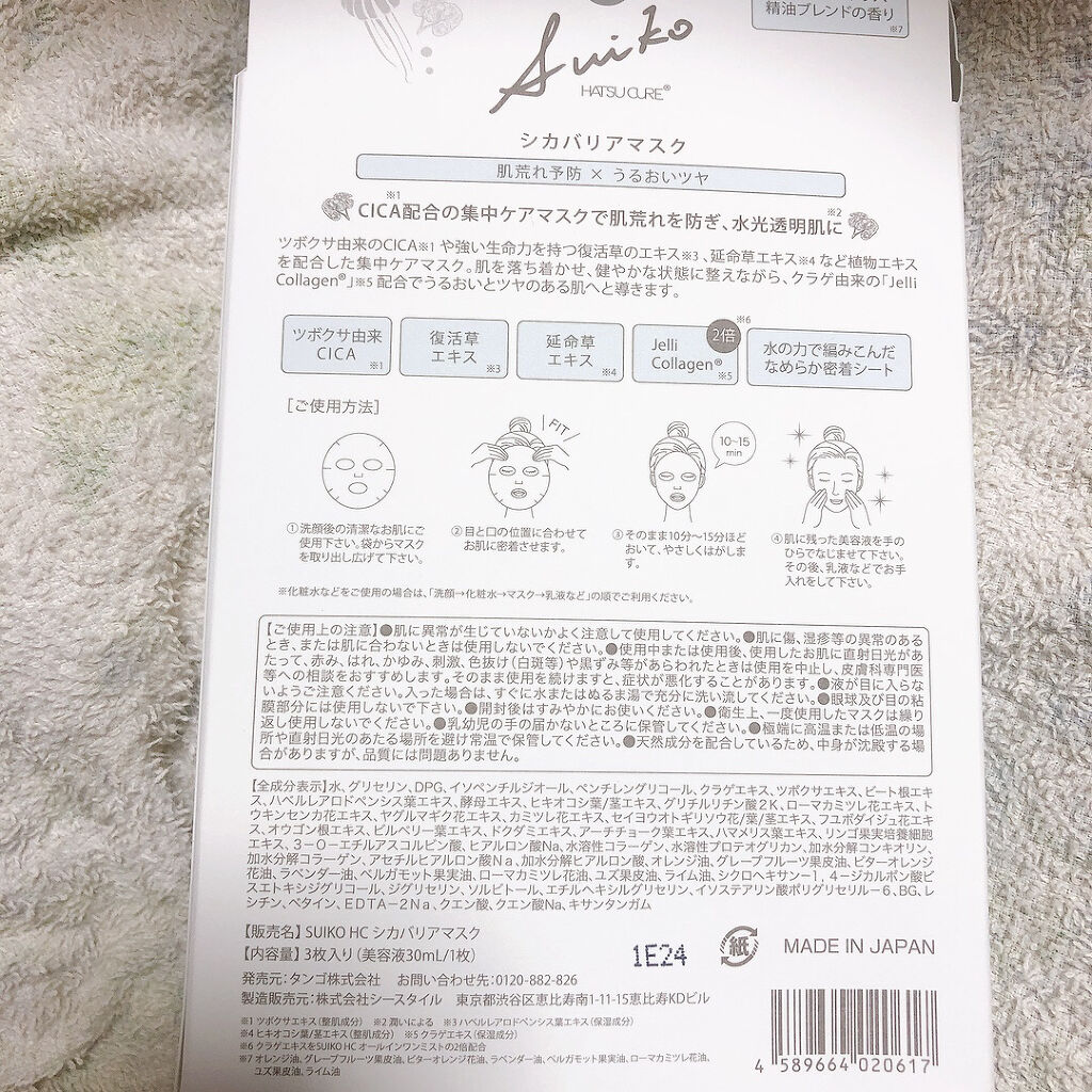 suikoから新しくシカラインが登場しましたꪔ̤̮♡ suikoの製品に配合されている Jelli Collagen®︎(クラゲエキス→保湿成分)に加えて、新たにCICA成分(ツボクサエキスや復活草)が配合されました♡゛ 厚めのシートに美容液がたっぷり染み込んでひたひたになったマスクを顔につけると浸透してる感じがして、すごくリラックスできます⺣̤̬︎︎ ✌︎︎︎ PM2.5やブルーライト、紫外線から肌を守ってくれるアンチポリューション成分(ドクダミエキスやビルベリー葉エキスなど)も配合されているみたいです! suikoのシカマスクは週に1回集中ケア用しっとりもちもちした肌を作ってくれます! 3枚入りで税込1,100円と少しお高めですが、試してみる価値があると思います(⸝⸝- -⸝⸝)♡