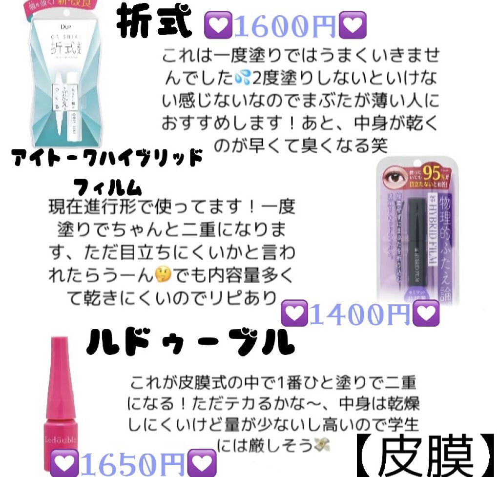 私がまず初めに手を出したのはAB アイプチという液体の商品でした!これがとてつもなく強力で奥二重の線が少し広がった気がします。 アイプチ3年目にして皮膜式の折式を使ってみました!リニューアル前のものを使っていたのでテカリが気になっていましたが今は改善したのかな?乾くのも早くて楽ちんでした! 奥二重の人はとにかく根気が必要だと思います、ななこちゃんのやり方でも二重にならなくて(奥二重の線を接着させてそのクッションで二重にさせる方法)