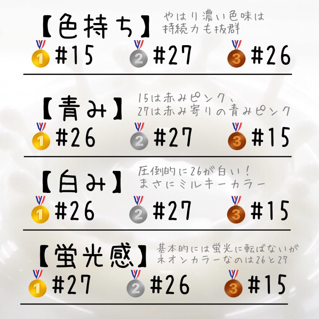 ロムアンドの新作ティントがブルベ優勝の青みピンクだったので手持ちのファンキーメロンと色味などを比較してみました! 【#26 very berry pink】⭐️新作白みの強い、まさにいちごミルクカラー。青みもあって、透明感が生まれる! 【#27 pink popsicle】⭐️新作やや赤みも感じる、鮮やかな青みピンク。しっかり塗るとネオンカラーに近いがティッシュoffすればナチュラルな仕上がり。 【#15 Funky Melon】やや青み寄りのピンクレッド。#27と激似だが、#15の方が赤みが強い。 《色持ち》#15が抜群だが、その他も🙆♂️《青み》やはり新作2色は青みが強い《白み》#26の方が#27より白っぽい #15は、ほとんど白みは無い《蛍光感》やや#27がネオンっぽい 📌#15が似合う方・お好きな方は新作2色もお気に召すと思います!(特に#15と#27はかなり似てるので使いやすいかも👌)
