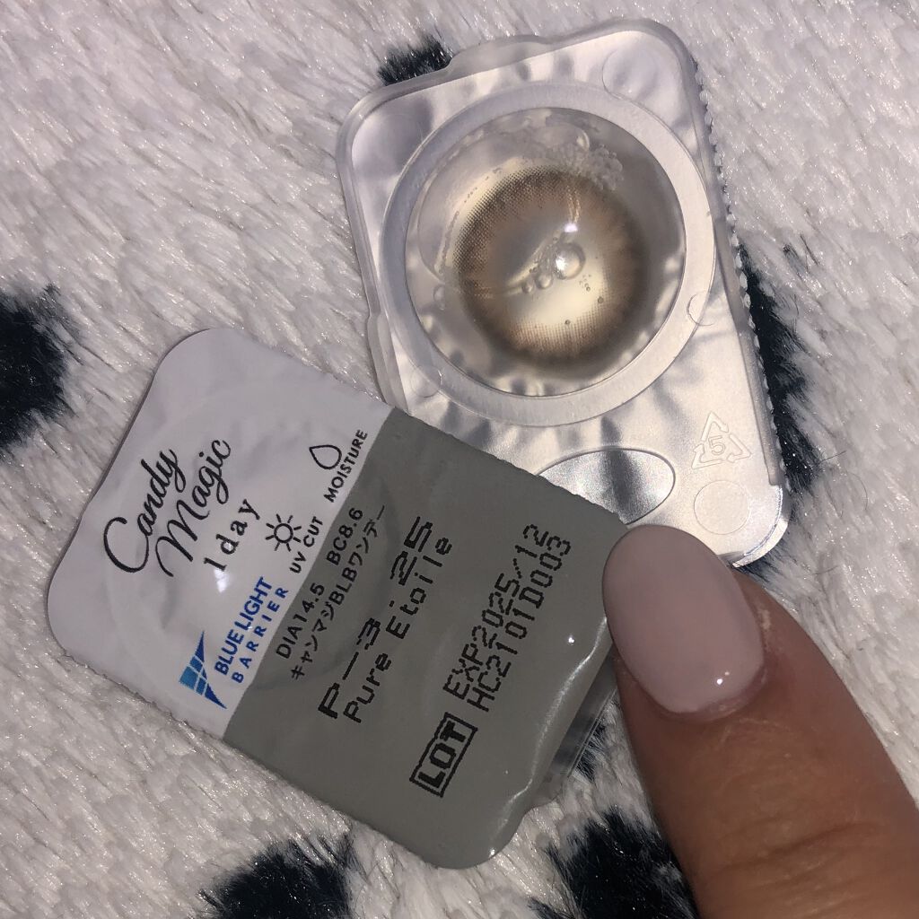 キャンディマジック品名:ピュアエトワール発色★★★☆☆使用感★★★☆☆フラッシュタだとガッツリですが自然光や室内灯だと自然に色素が薄くてめちゃくちゃ可愛いです😭💓普段黒ふち茶コンばっかりで、久々にドキッとしたカラコン❣️髪やリップの色は清楚系...