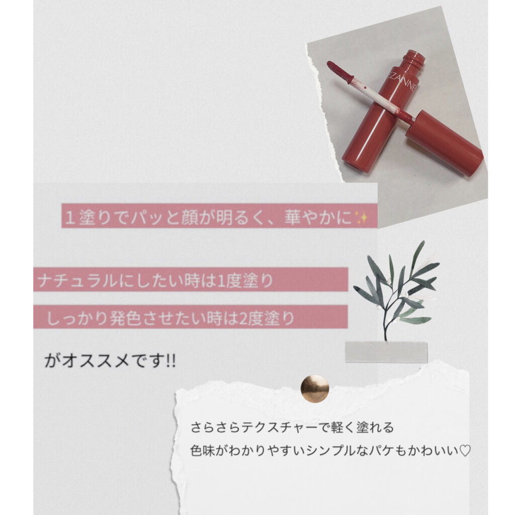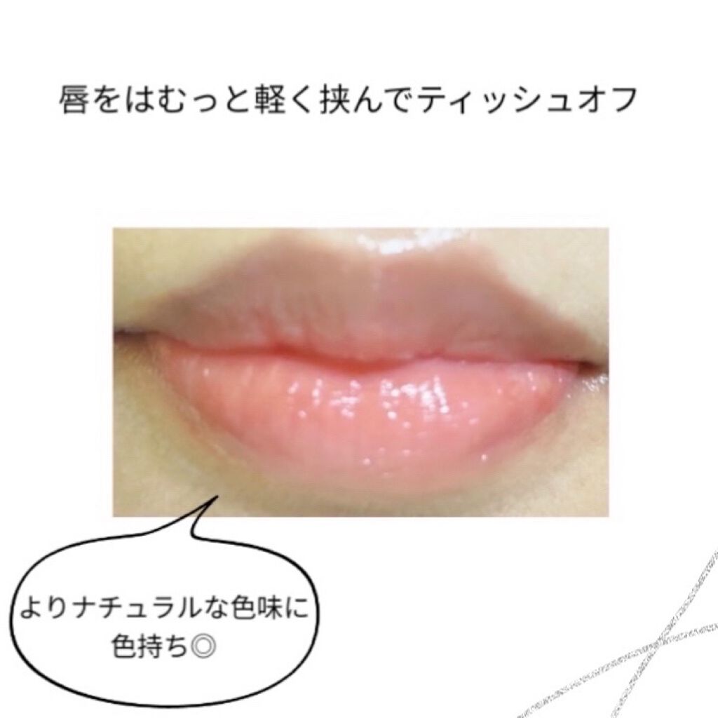 ・唇に血色を与えてくれる、優しいピンク ・1塗りで顔がパッと明るくなる ・水々しいさらさらテクスチャー ・うるっとツヤ感、ちゅるんとした唇になれる ・乾燥しにくい ・先に薬用リップなどで保湿し、その上に塗ればより保湿される ・チップが液をたっぷり含むので、ボトルの縁で少し液を落とすと丁度よくなります◎ ・1度塗りで唇を中央に乗せ、"んーま”と上下の唇を擦り合わせると、ナチュラルに発色します。 ・もし塗りぬれてない部分があった場合→塗り濡れてない部分だけに塗ると◎ ・ティッシュオフしても、ツヤ感は残り、色持ちが良かったです◎ ・ほのかに着く程度なので、塗ってすぐではなく、5分くらい乾燥させるとよりティッシュに付かなくなると思います😊 ・ティッシュオフ後はよりナチュラルな色味になりました。 ・2度ティッシュオフすると、2度目は付かなくなり、マスクにもつきませんでした◎ ・マスクしても色持ちがいいのでマスクメイクにも、なかなかお直しができない時にもおすすめです!