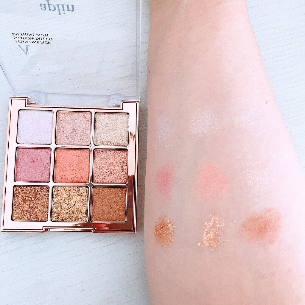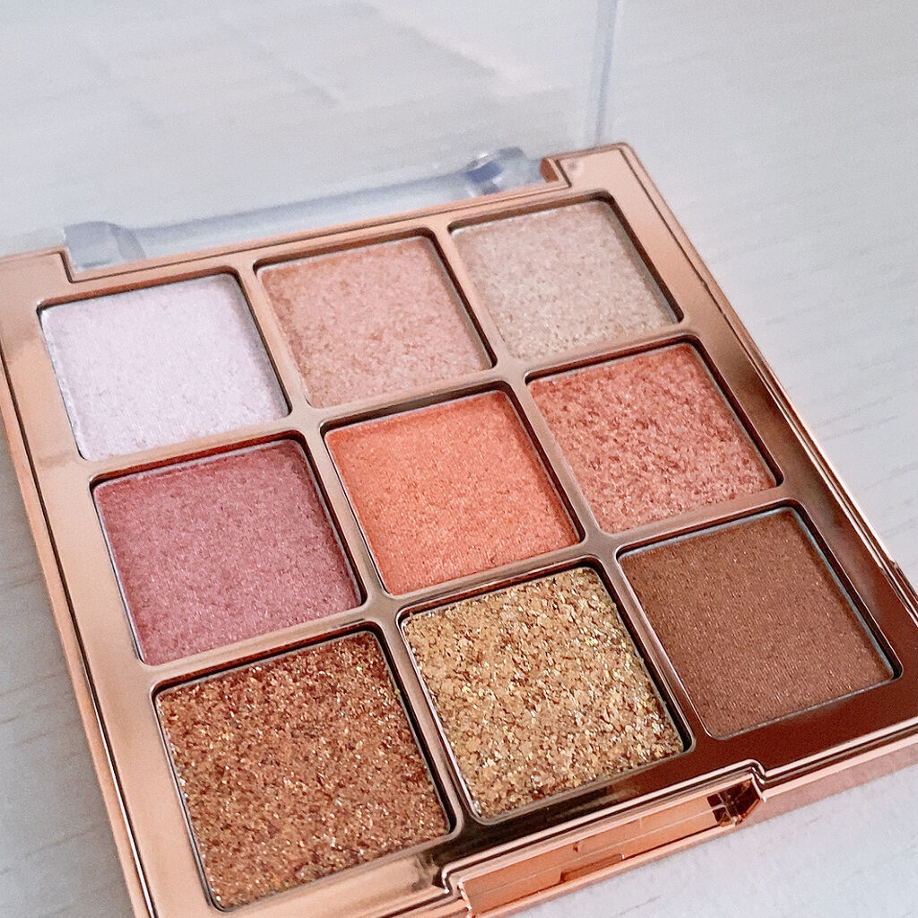 洗練された9色のカラーが可愛い、 今回使用の02 シャインラッシュはallラメ!! fairy tears(上段中央)や、romantic love(中段左)など、 上段3色は上品な細かいラメで、 アイホールや涙袋をパッと明るくしてくれます。 中段3色はおしゃれなニュアンスカラー! 温かみのある色合いで、ハッピーオーラを纏う目元に。 下段3色はキラキラのサンドカラー! 真ん中のshampagne showerは大粒のホログラム入りです💕 9枚目でホロをのせてみてます! さりげなくきらめいて可愛い♡ 思ったよりもコンパクトで、持ち歩きにも便利。 昼間は細かいラメ、夜からは大粒ラメをちょい足しも良さそう!🌟 組み合わせによって色々なシチュエーションを楽しめるし、 可愛くて持ってるだけでアガるパレットです〜💕