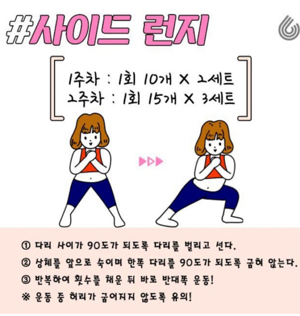 시저스크로스1週間目1日20回×2セット2週間目1日20回×3セット 사이드레그레이즈1週間目1日15回×2セット2週間目1日20回×3セット 크런치 킥1週間目1日15回×2セット2週間目1日20回×3セット 사이드 런지1週間目10回×2セット2週間目15回×3セット