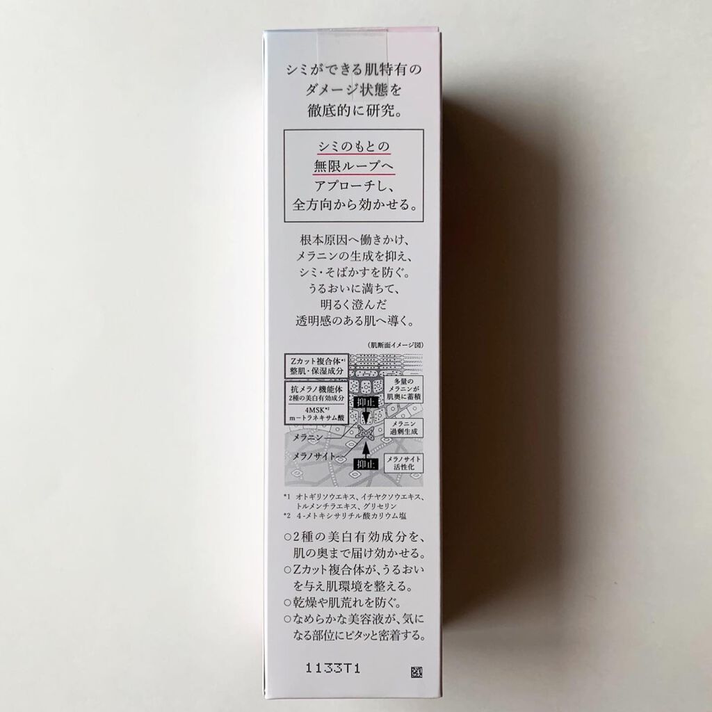 - シミのもとの無限ループへ。薬用 美白美容液 シミができる肌特有のダメージ状態を徹底的に研究。 シミのもとの無限ループへアプローチし、全方向から効かせる。 根本原因へ働きかけ、メラニンの生成を抑え、シミ・そばかすを防ぐ。 2種の美白有効成分を、肌の奥まで届け効かせる。 うるおいに満ちて明るく澄んだ透明感のある肌へ導く。
